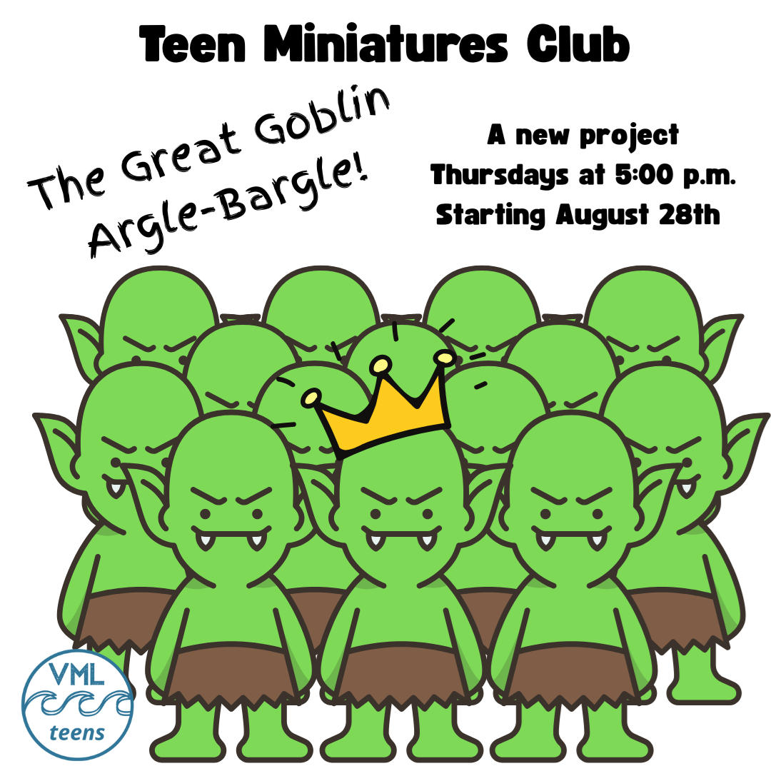 Reminder: No Miniatures meeting on 1/1 for New Year's Day. Have you seen people playing tabletop RPGs or other games with figurines or terrain? Have you ever thought that it might be fun to do that but you just don't know how to get started? Are you between the ages of 12-18? Come check out the Teen Miniature Club! We'll be building, painting, and even playing games with miniatures. "Once every few years, when the moon is just right, when the perfect scent of fungus is on the wind, when the moss grows on the east face of the rocks, when there are just enough goblins around, that means it's time for... THE GREAT GOBLIN ARGLE-BARGLE!" If you have any questions, feel free to email Tom, the Reference Assistant, at twhite@marshfield.ocln.org