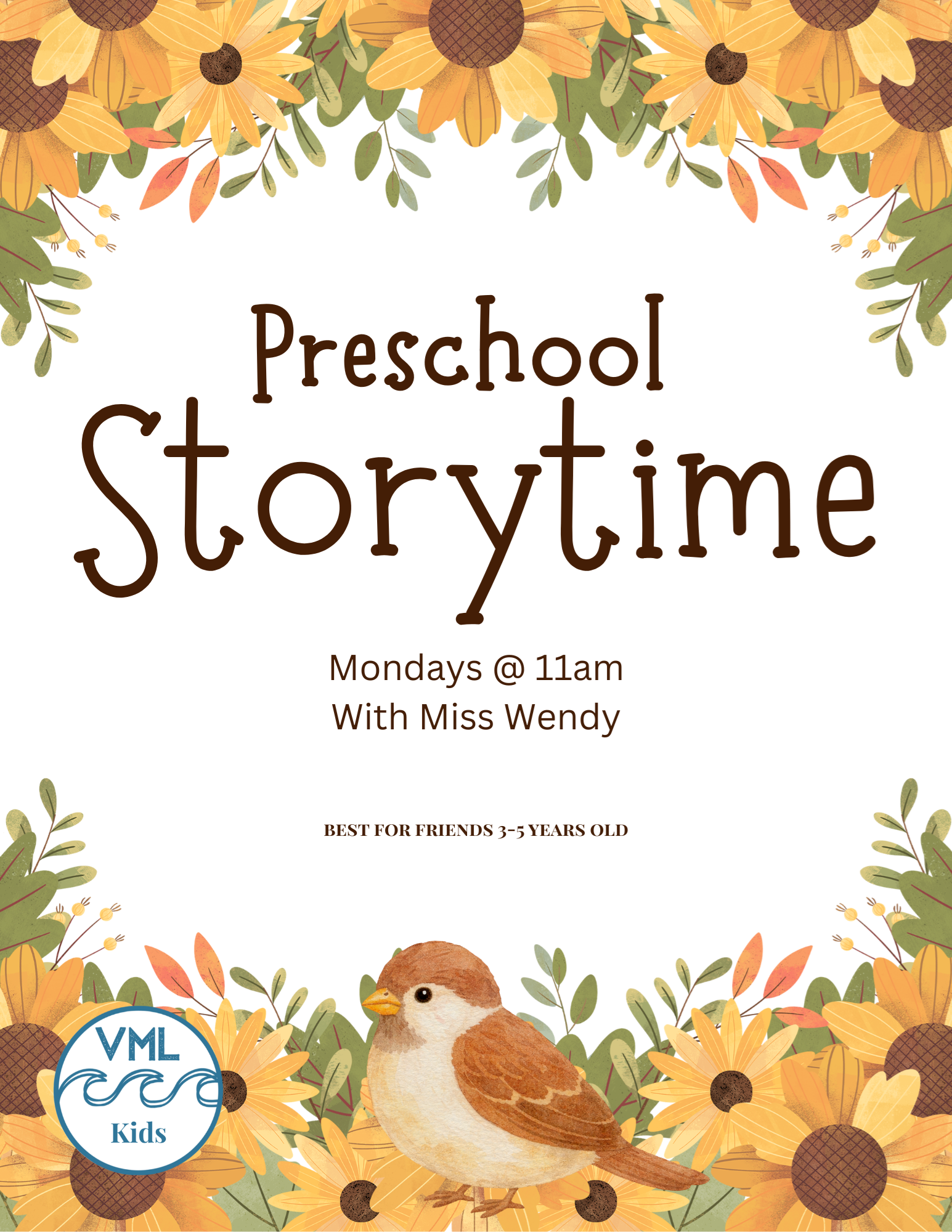 Mondays, 9:30 and 11 a.m. Start back up on March 16th! Join us in the Children's Program Room for stories, songs and socialization. Toddlers at 9:30am: 13 months- 2 years Preschool at 11am: 3-5 years