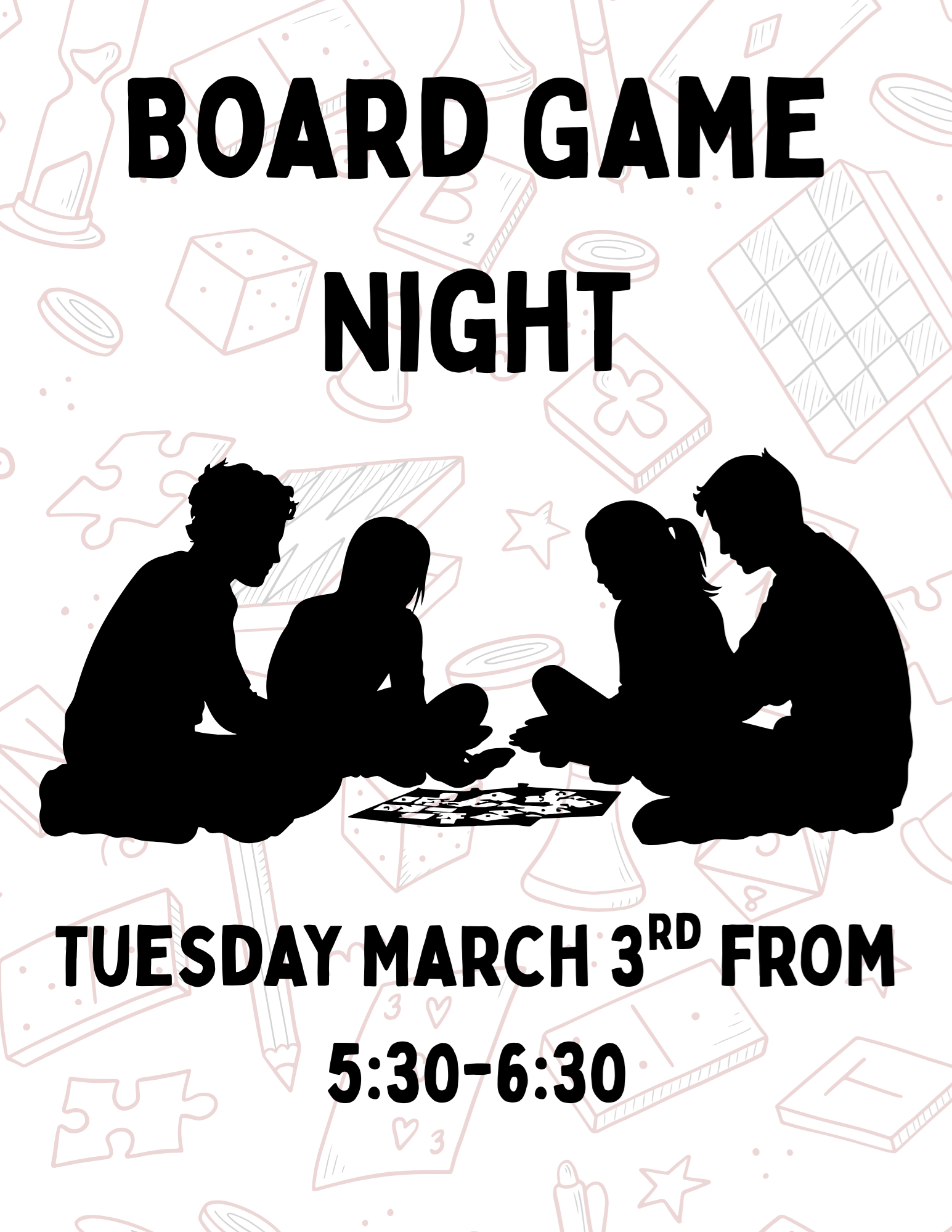 Tuesday, March 3rd, 5:30-6:30 PM Join us on Tuesday March 3rd from 5:30-6:30 for game night. Grab a friend and come play a selection of board and card games. Snacks and drinks will be provided. Grades 6-12 only.