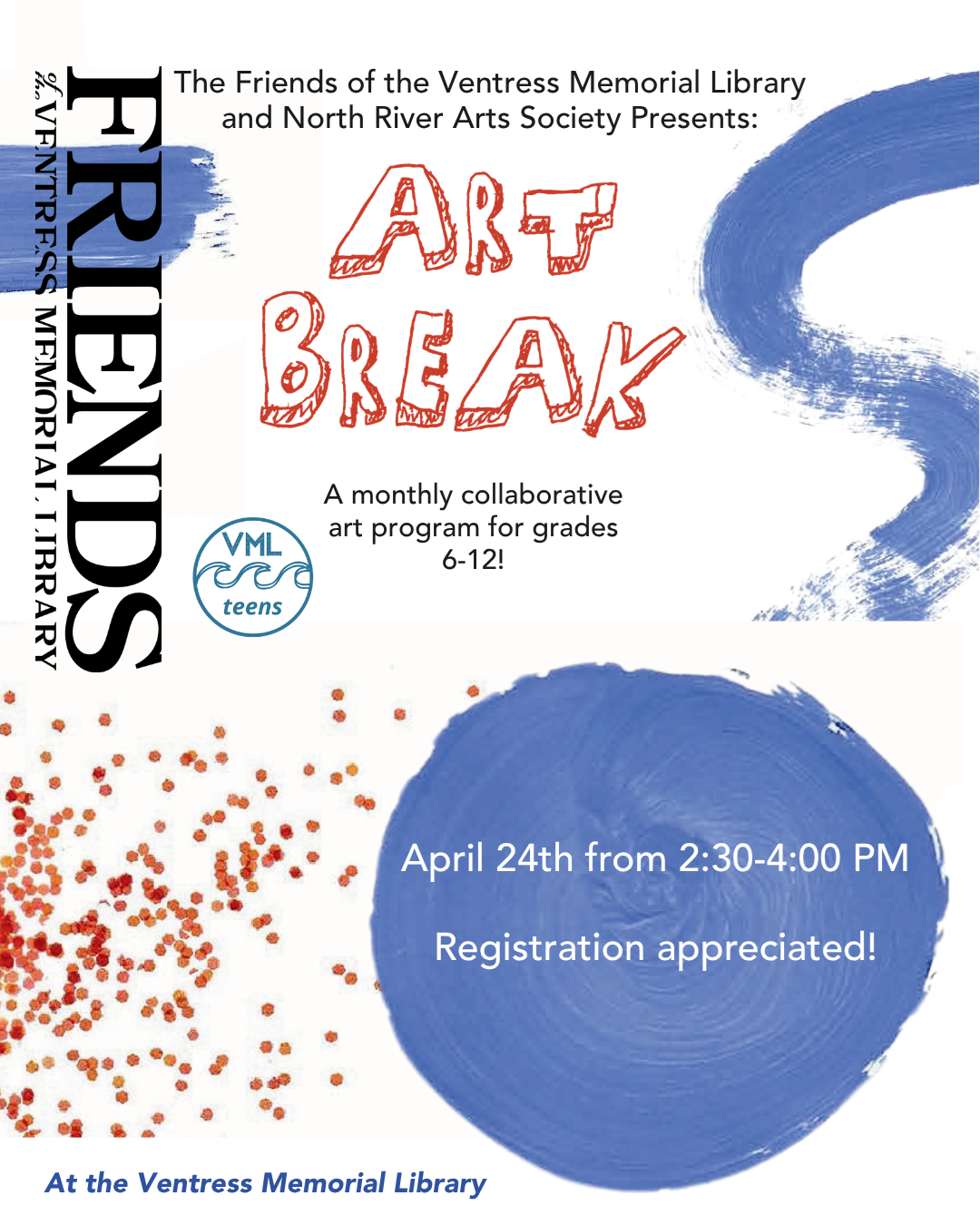 The next installment in the new collaborative art series between the Ventress Memorial Library and the North Rivers Arts society, Art Break! This program, sponsored by the Friends of the Ventress Memorial Library, will run once a month in 2026. Each class will feature a project aimed at teaching new skills, or learning about different forms of art and art centric careers! This month is ink and watercolors. For grades 6-12 only. Registration is Appreciated.