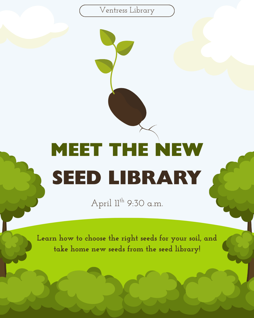 Saturday, April 11th, 9:30 a.m. Did you know that the Ventress Library has a new and improved seed library? You'll find it next to the "Staff Picks" display in our old card catalog. Patrons can take up to 5 seed packets per person, per visit. Stop by and check out the collection of seeds -- we have everything from veggies to flowers to herbs. The seed library is available any time the library is open. To celebrate the opening of the seed library, we will be having a Master Gardener program on April 11th! Learn about how to read seed packets and how to determine which seeds would be a good fit for your growing location! Get a guided tour of our new Seed Library and head home with your own new seed collection!