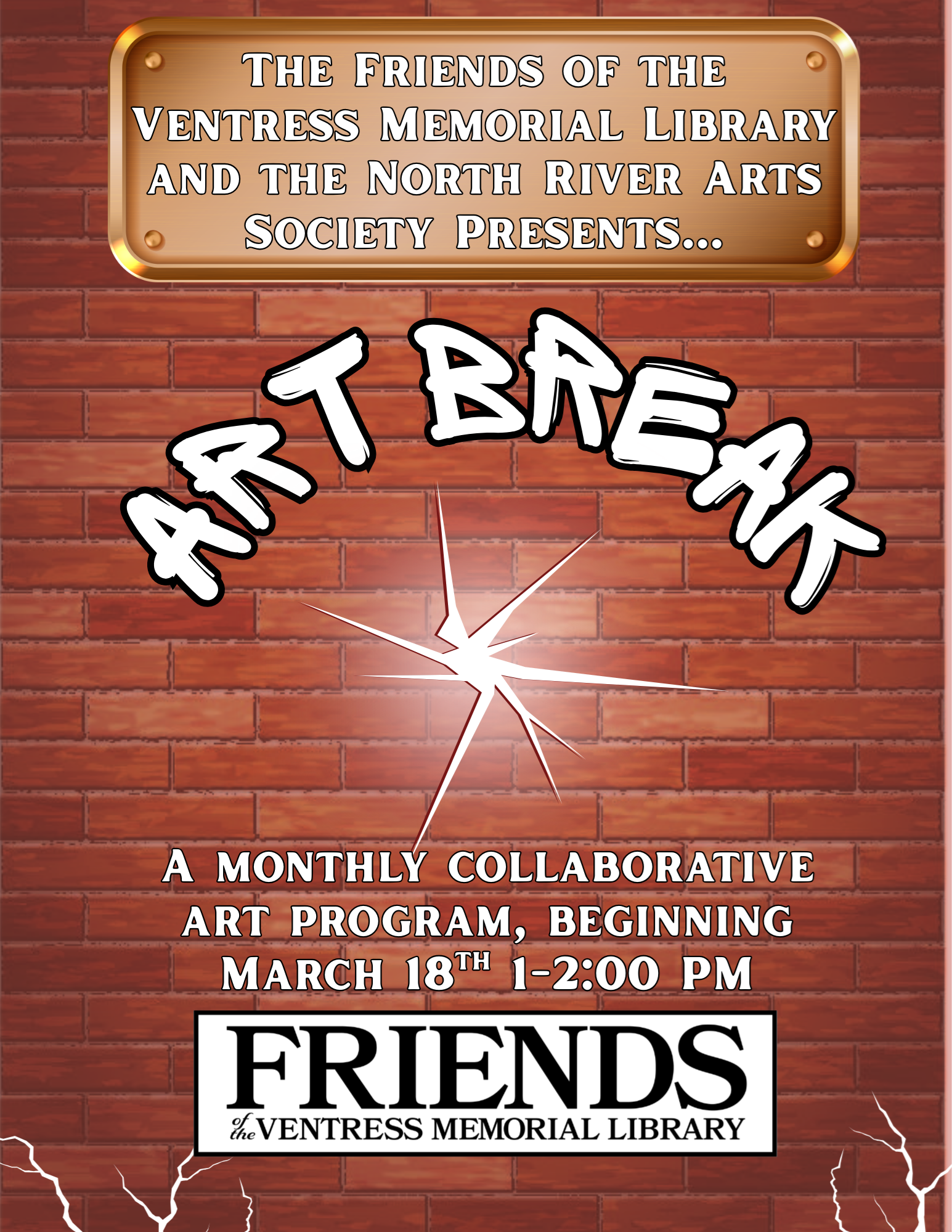 Art BreakWednesday, March 18th, 1:00-2:00 p.m. The first instalment in the new collaborative art series between the Ventress Memorial Library and the North Rivers Arts society, Art Break! This program, sponsored by the Friends of the Ventress Memorial Library, will run once a month every month. Each class will feature a project aimed at teaching new skills, or learning about different forms of art and art centric careers! This month is ink and watercolors. For grades 6-12 only. Registration is Appreciated.