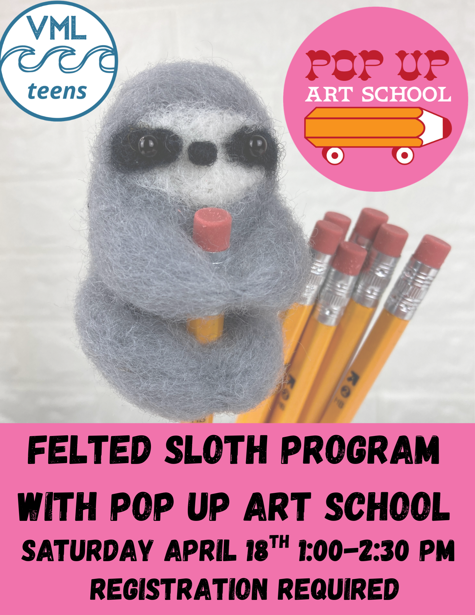 Saturday, April 18th, 1:00-2:30 p.m Pop Up Art School will be showing participants how to make everyone's favorite slow-moving forest dweller. Learn how to felt a sloth using a special needle and wool. Needle felting is fun and easier than you think. Registration required.