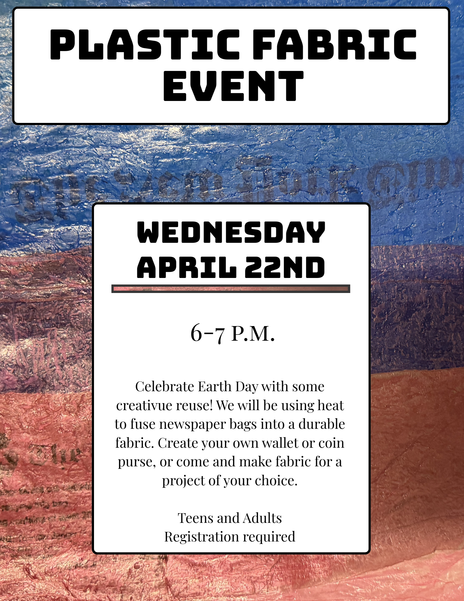Wednesday April 22nd, 6:00-7:00 p.m. Celebrate Earth Day with some creative re-use! We will be fusing together recycled newspaper bags to create a sturdy, flexible fabric that can be made into a wallet or change purse. Blend multiple colors of plastic together to create unique textiles! For adults and teens. Registration required.