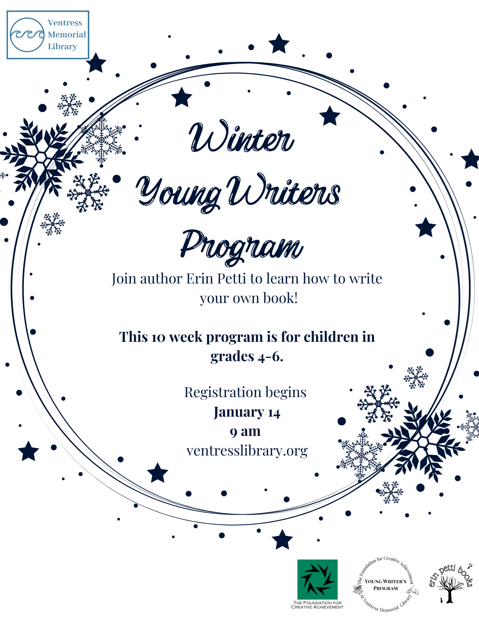 Opens January 7th, 9:00 a.m. Young Writers Program is a 5 WEEK program for aspiring writers in grades 4-6. Children will work with published author Erin Petti to learn about and create their own books. Registration is mandatory and fills up fast! Registrations are through the website calendar ONLY. We are unable to accept phone calls or emails for registration. This is a 5 WEEK commitment! Young Writers Program runs on Wednesdays from 5:00 pm - 6:00 pm, beginning on January 14th and ending on February 11th.