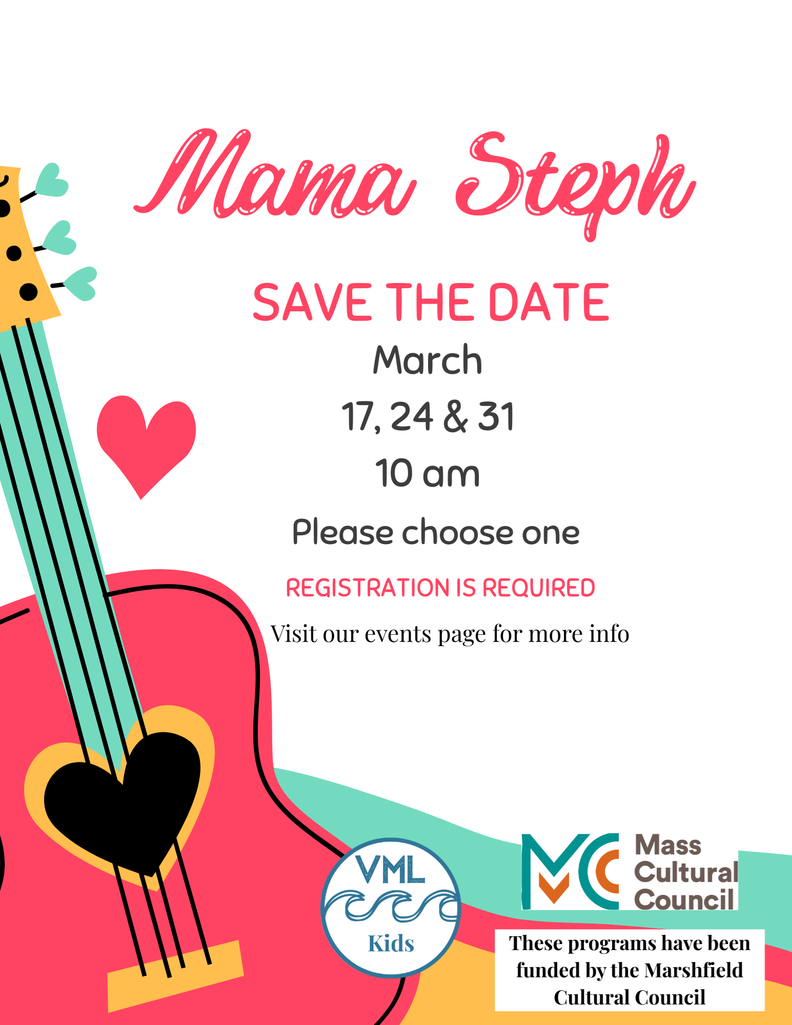 Join local singer- songwriter Mamasteph for songs, stories, and sing-alongs. Mamasteph is a local favorite and has performed at various libraries, schools, and other locations across the South Shore. She has released four albums including Little Mouse, Little House. This program is best for young children and their caregivers.