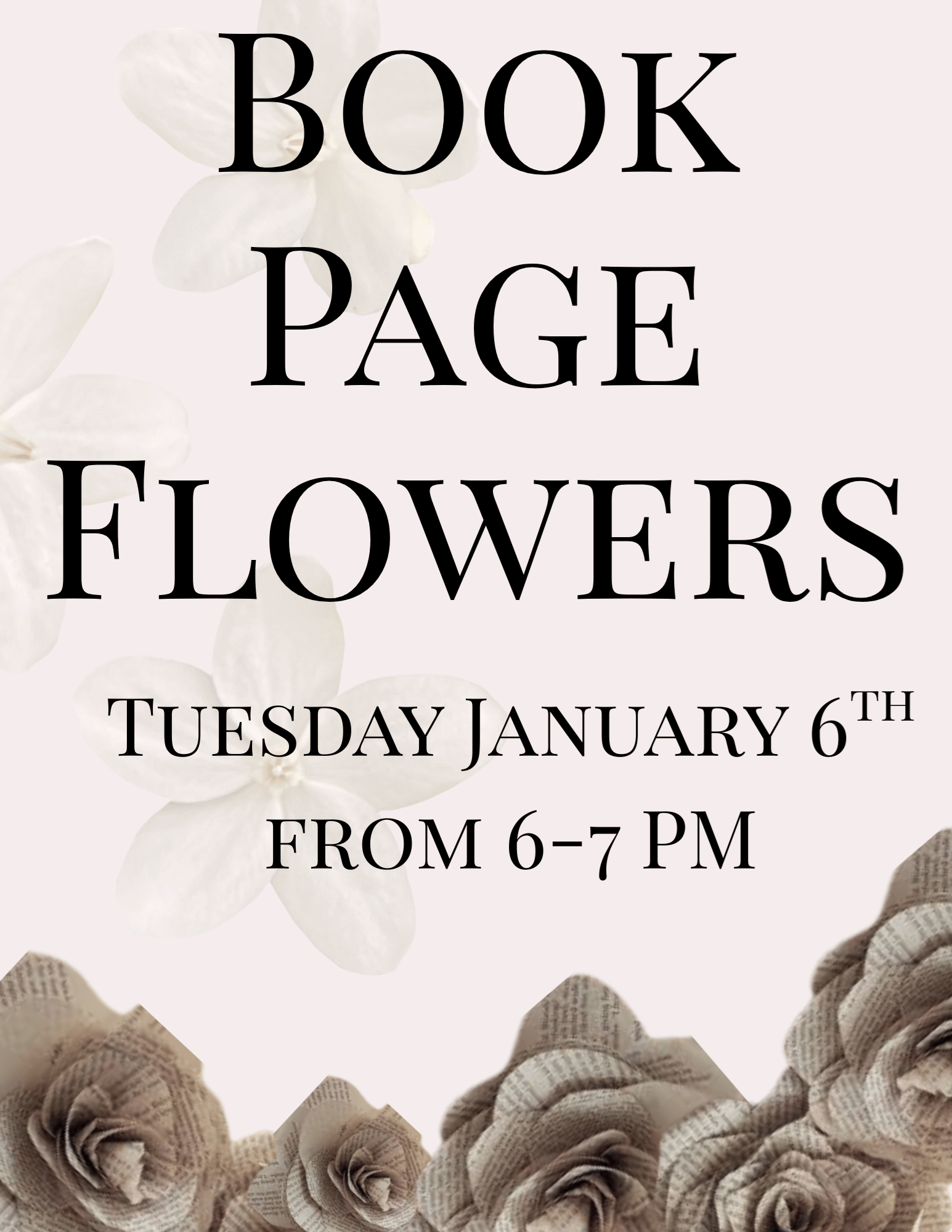 Tuesday, January 6th, 5:00-6:00 PM Upcycle old books to look like beautiful paper flowers! Grades 6-12 only. Registration required.