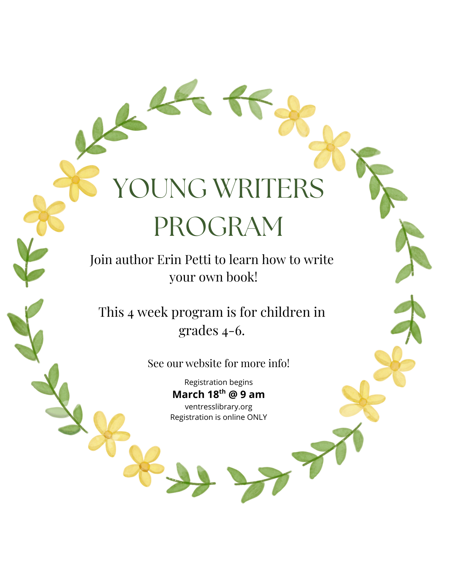 Wednesday, March 18th, 9 a.m. This year's Spring Young Writers Program is a 4 WEEK program for aspiring writers in grades 4-6. Children will work with published author Erin Petti to learn about and create their own books. Registration is mandatory and fills up fast! Registrations are through the website calendar ONLY. We are unable to accept phone calls or emails for registration. This is a 4 WEEK commitment! Young Writers Program runs on Wednesdays from 5:00 pm - 6:00 pm, beginning on March 25th and ending on April 15th.