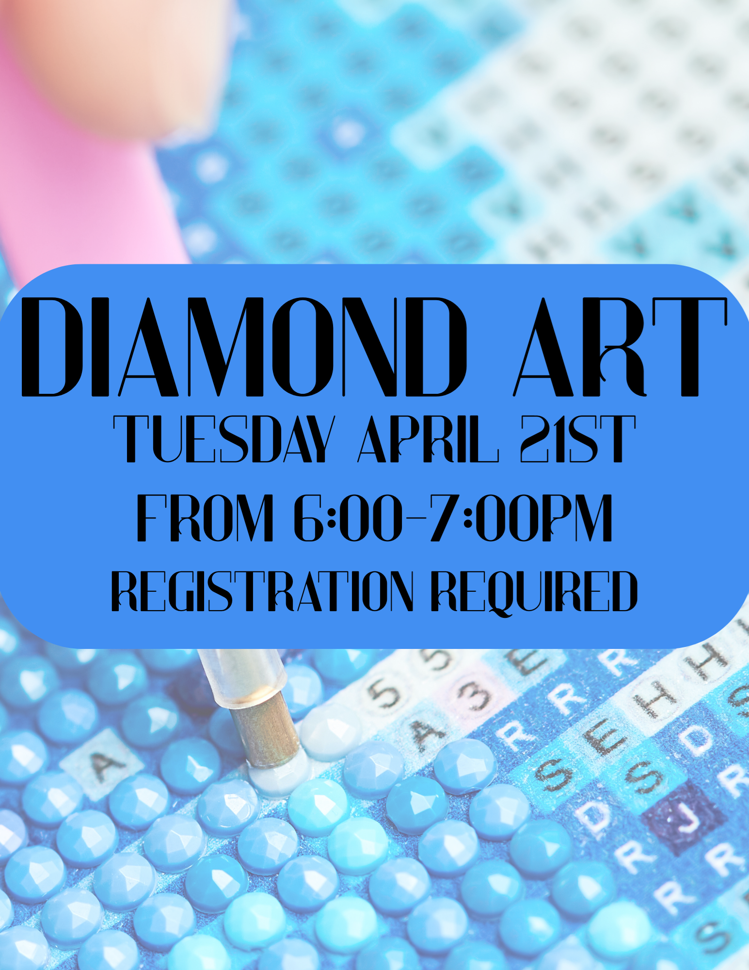 Tuesday, April 21st, 1:00-2:00 p.m. We will be hosting a Diamond Art event! Using small, colorful resin diamonds, participants will follow a pattern to create a 3D piece. All materials will be provided; registration is required. Grades 6-12 only.