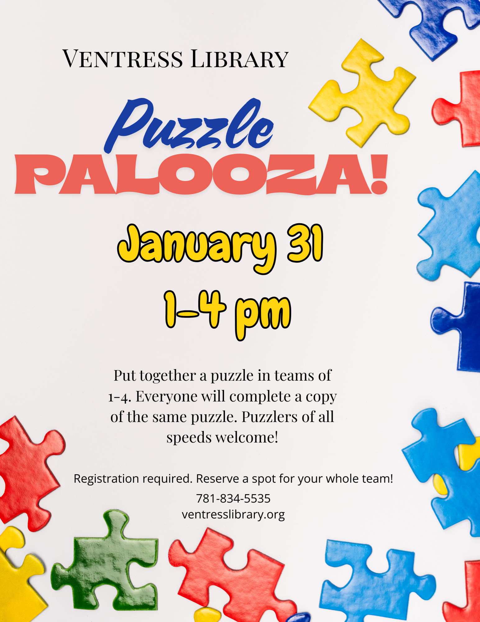 Rescheduled from November! Join us for an afternoon of jigsaw puzzle fun! Sign up in a team of 1 to 4 people. Each team will have the same puzzle to complete! Puzzlers of all ages and speeds are welcome. Registration required.