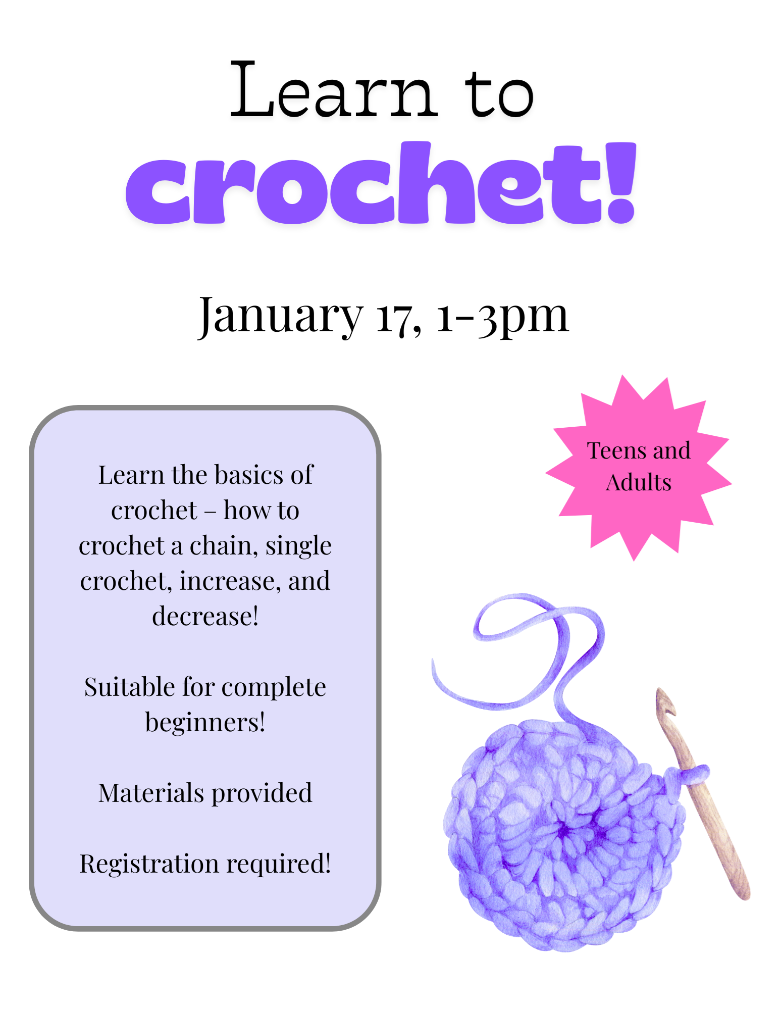 Saturday, January 17th, 1-3 p.m. Start the new year off right by learning a new craft! You will learn chain stitch, single crochet, and basic increases and decreases! Materials will be provided to registered attendees.