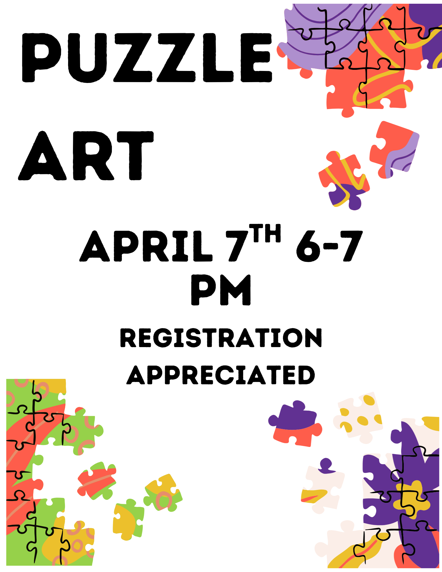 Tuesday, April 7th, 6:00-7:00 PM Come create artwork with an additional challenge, using upcycled old puzzles featuring a variety of styles, shapes, and colors. All participants will be given puzzle pieces as well as paint to create a piece of artwork.