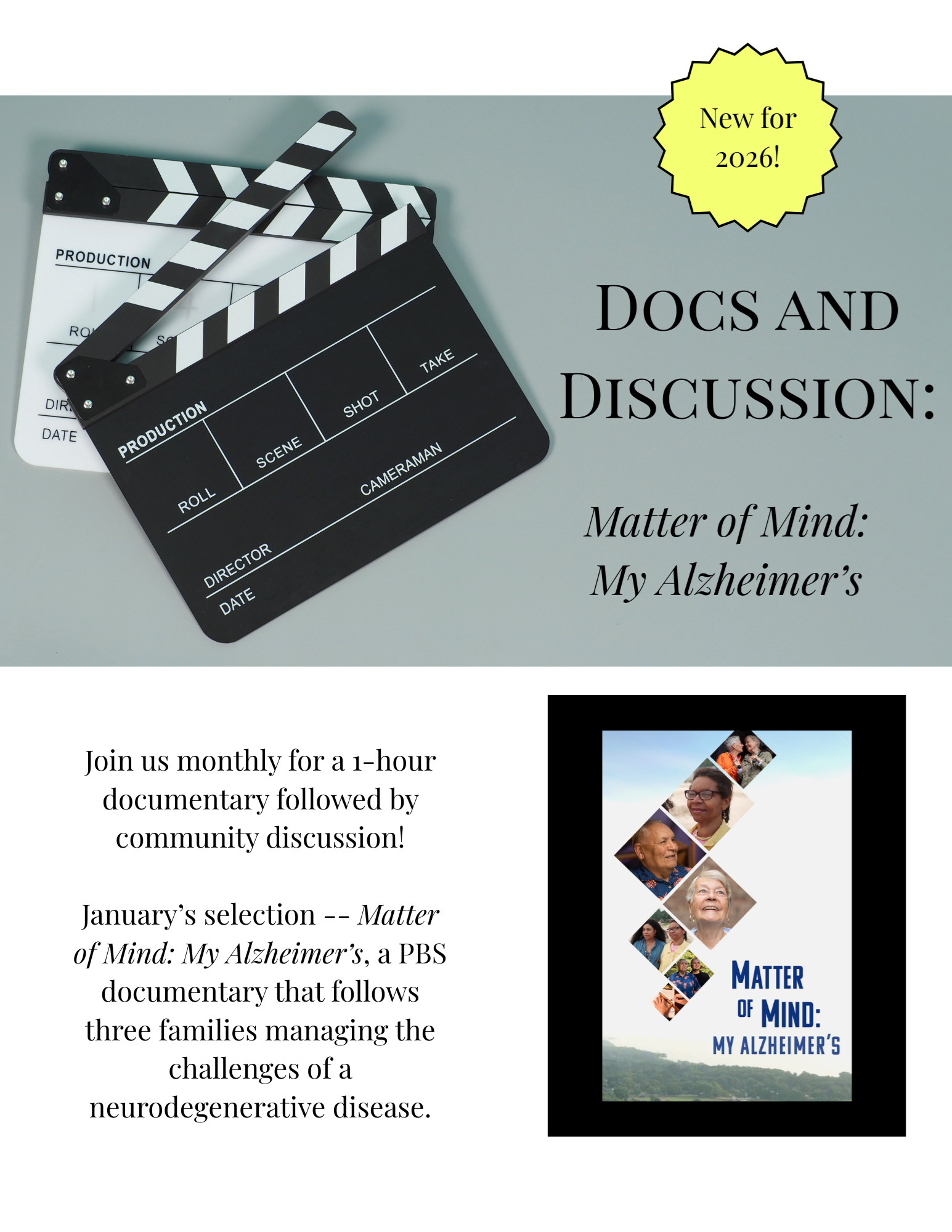 January 5th, 6:00pm New for 2025! Docs and Discussion is a monthly program featuring a short documentary, followed by community discussion. This month's title -- Matter of Mind: My Alzheimer's. Anchored by deeply loving bonds, three families grapple with the challenges of Alzheimer’s: a son helps his father create art through dementia, a daughter cares for her mother who has early-onset Alzheimer’s, and a couple struggles to maintain their fragile equilibrium as symptoms advance. Each pair fights to maintain their connection as the illness transforms their relationships and identities.
