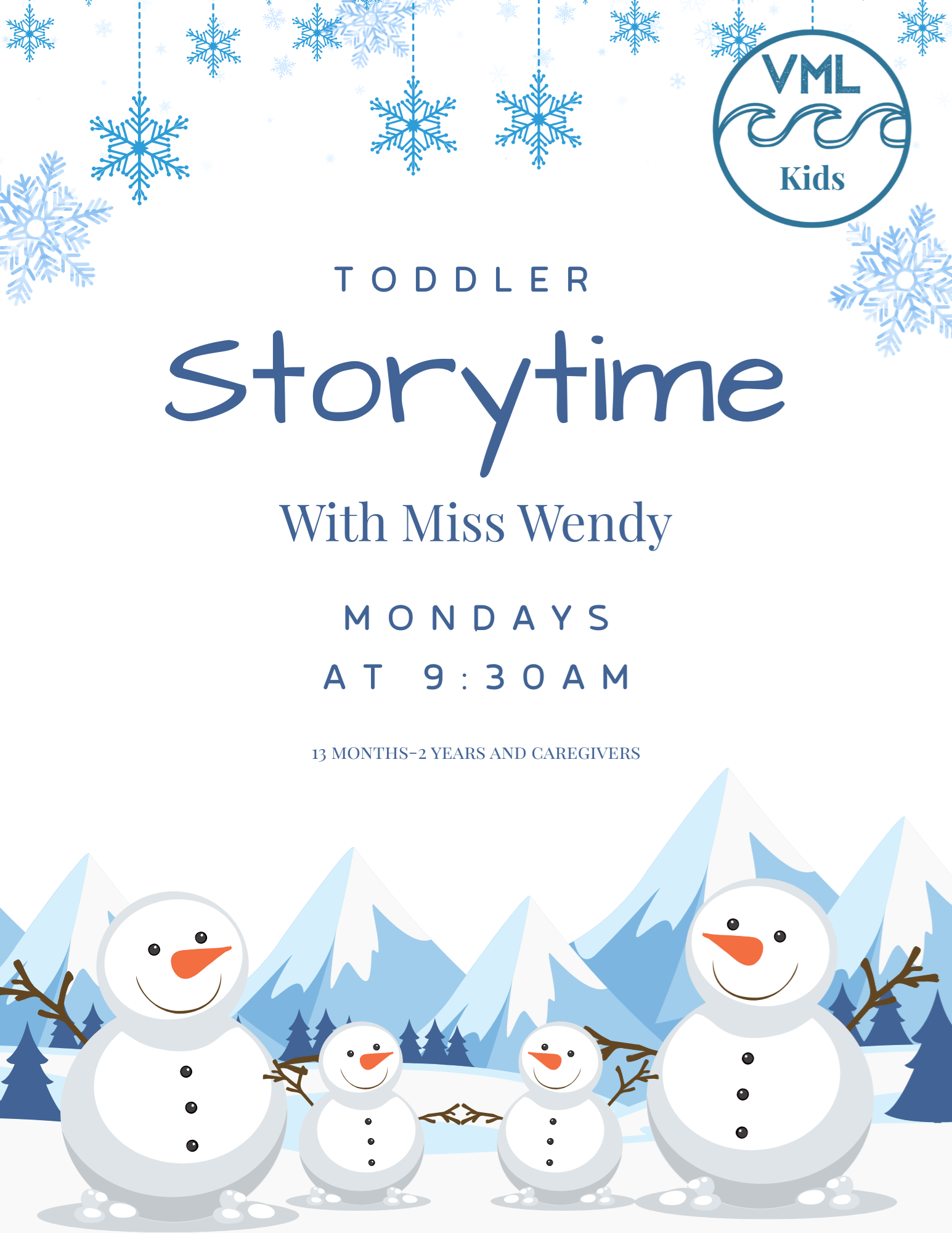 Mondays at 9:30 and 11:00 a.m. Join Miss Wendy in the Children's Program Room for stories, songs and socialization. Mondays at 9:30 am for toddler storytime (13 months- 2 years) and 11:00 am for Preschool Storytime (3-5 years).
