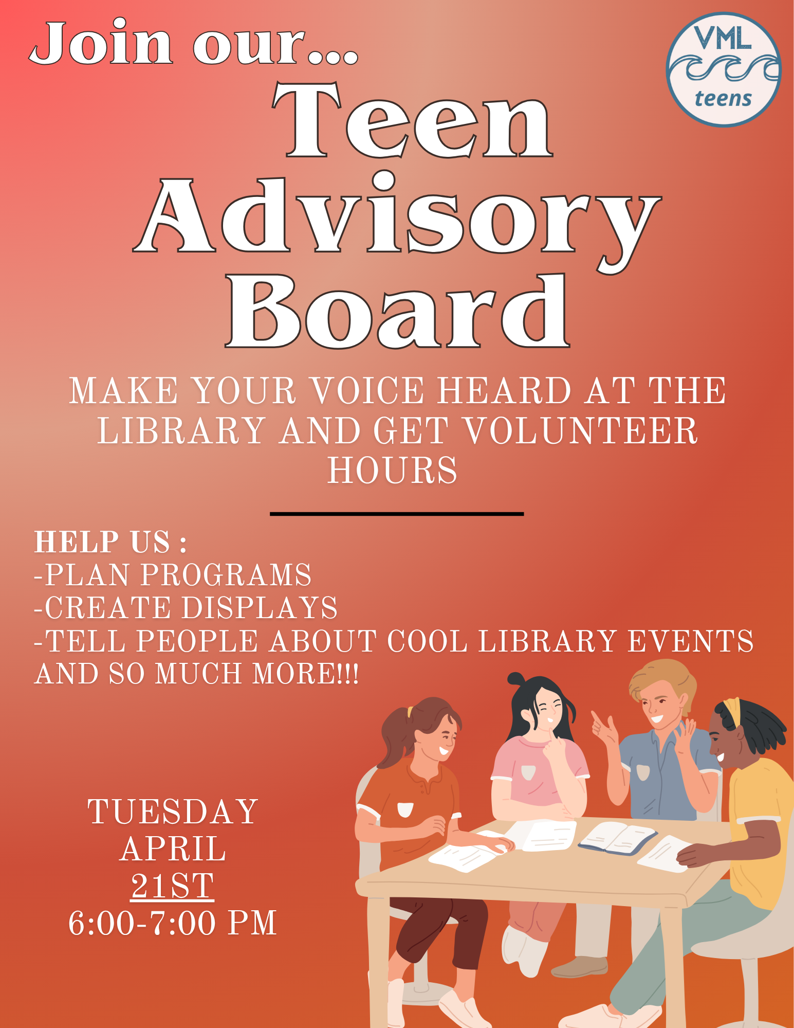 Tuesday, April 21st, 6:00-7:00 p.m. The Ventress Memorial Library Teen Zone will be having monthly Teen Advisory Board (TAB) meetings. The advisory board will help plan and implement programs and help shape the future direction of Teen Services at the Library. Attendance at these meetings can be counted towards volunteer hours, but to do so, make sure to fill out our volunteer form! For grades 6-12 only. Registration appreciated.