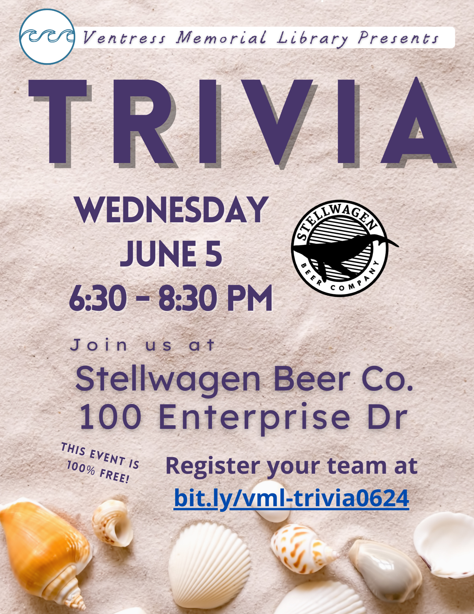 Trivia at Stellwagen Wednesday, June 5 from 6:30 - 8:30 p.m. Stellwagen Beer Company | 100 Enterprise Drive We are excited to offer another outreach trivia event! Compete for cool prizes and show off your trivia prowess at Marshfield's local brewery.