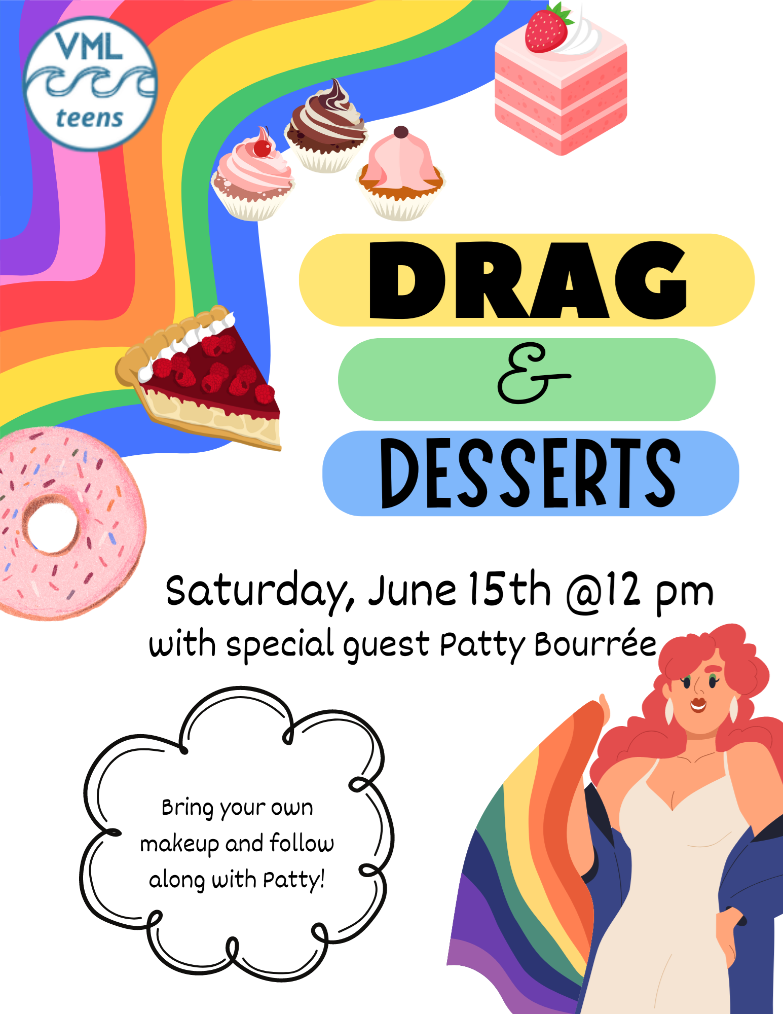 Drag & Desserts! Saturday, June 15 from 12:00 - 2:00 p.m. The Teen Zone is proud to welcome Patty Bourree for an afternoon of desserts and learning about drag culture! Teens ages 12-18 are encouraged to bring their own makeup and get dolled up alongside Patty!