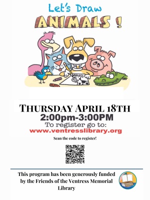 Let's Draw Animals Thursday, April 18 from 2:00 - 3:00 p.m. So many of you asked for a second program, so we are bringing him back again for a repeat program! Learn to draw cartoon animals in this live in person program with award winning cartoonist Rick Stromoski. This program is for children ages 6-12 and their caregivers.