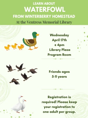 Water Fowl at the LibraryWednesday, April 17 from 4:00 - 5:00 p.m. Come learn about the ecology, habitats, and biology of sea birds and interact with live ducks and geese while learning about their unique morphology! This event is for our friends ages 5-11. All children under 9 years old must be with a caregiver. Registration required.