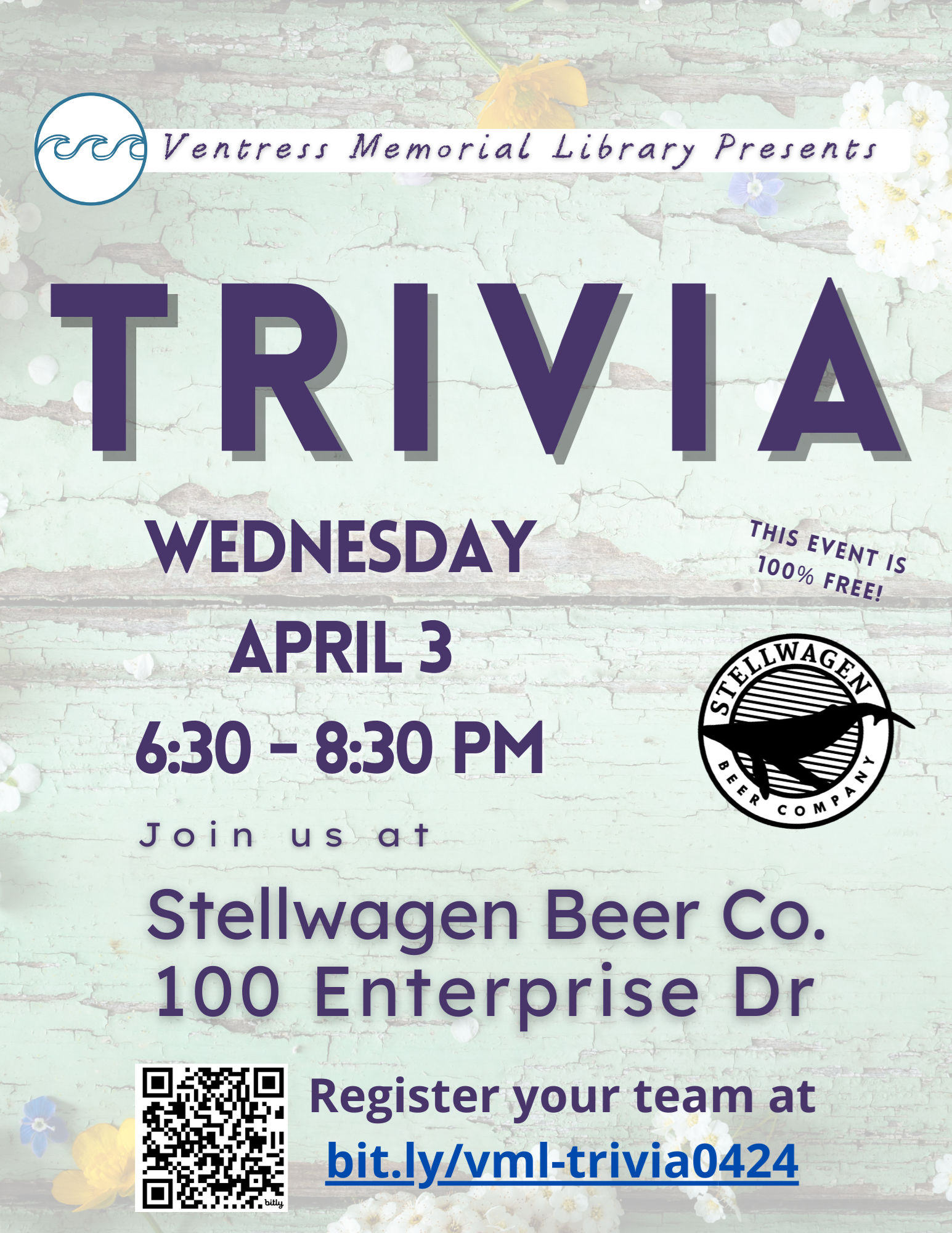 Trivia at Stellwagen Beer Co.Wednesday, April 3, 6:30 - 8:30 p.m. Join us once more at Stellwagen Beer Company, 100 Enterprise Drive in Marshfield, and compete with your team to compete in four rounds of trivia. Register Your Team today!