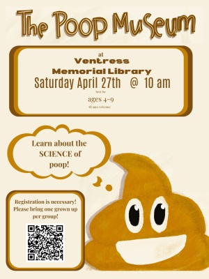 The Poop MuseumSaturday, April 27 from 10:00 - 11:00 a.m. The Poop Museum covers the serious science of poop and pooping, and is delivered with the silliness that you might imagine accompanying a program about poop for young kids. Aimed at the 4-9 age group, the program engages kids as young as 3 and as old as 12. Registration Required.
