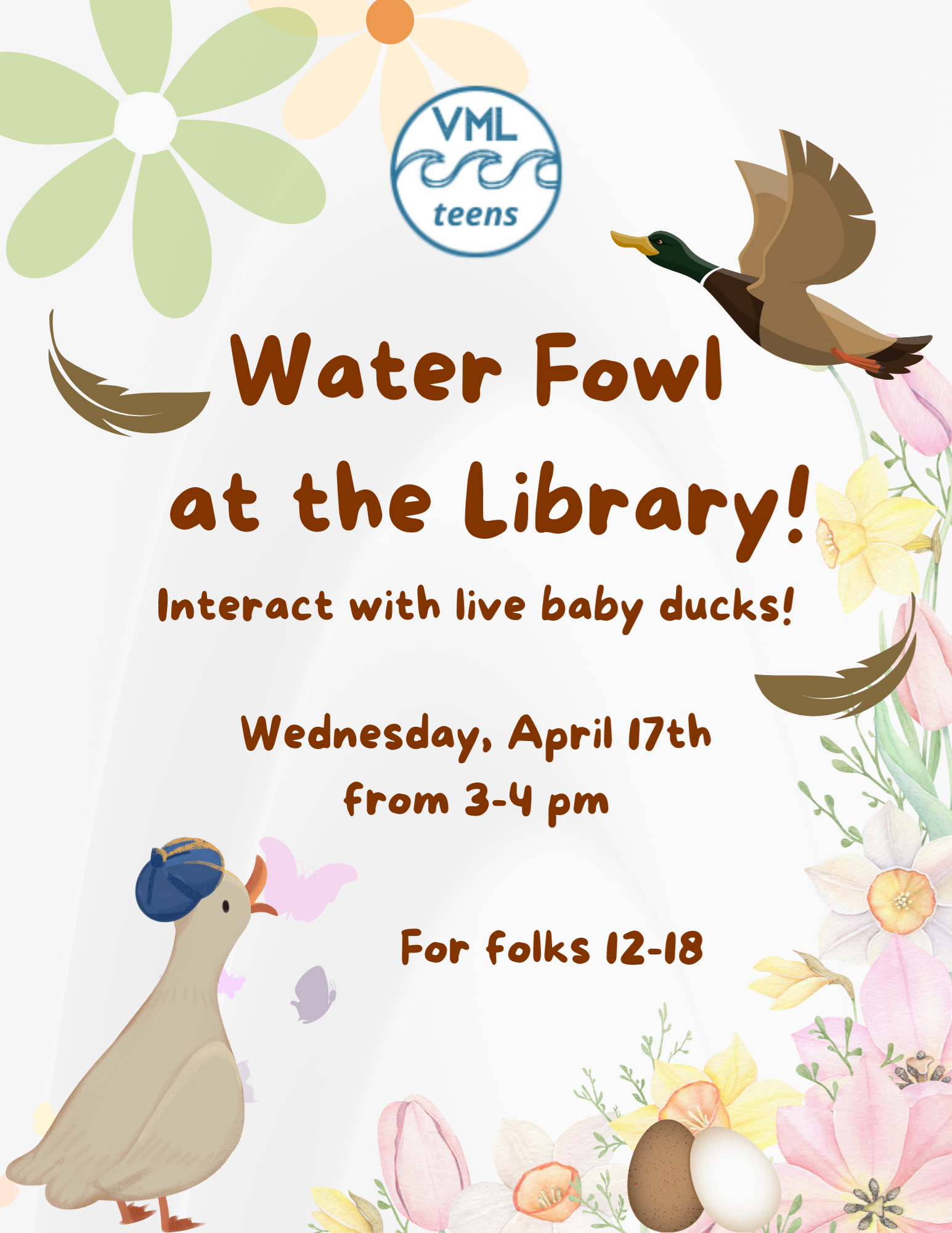 Water Fowl at the Library Wednesday, April 17 from 3:00 - 4:00 p.m. Come learn about the ecology, habitats, and biology of sea birds and interact with live ducks and geese while learning about their unique morphology! This event is for folks 12-18 only.