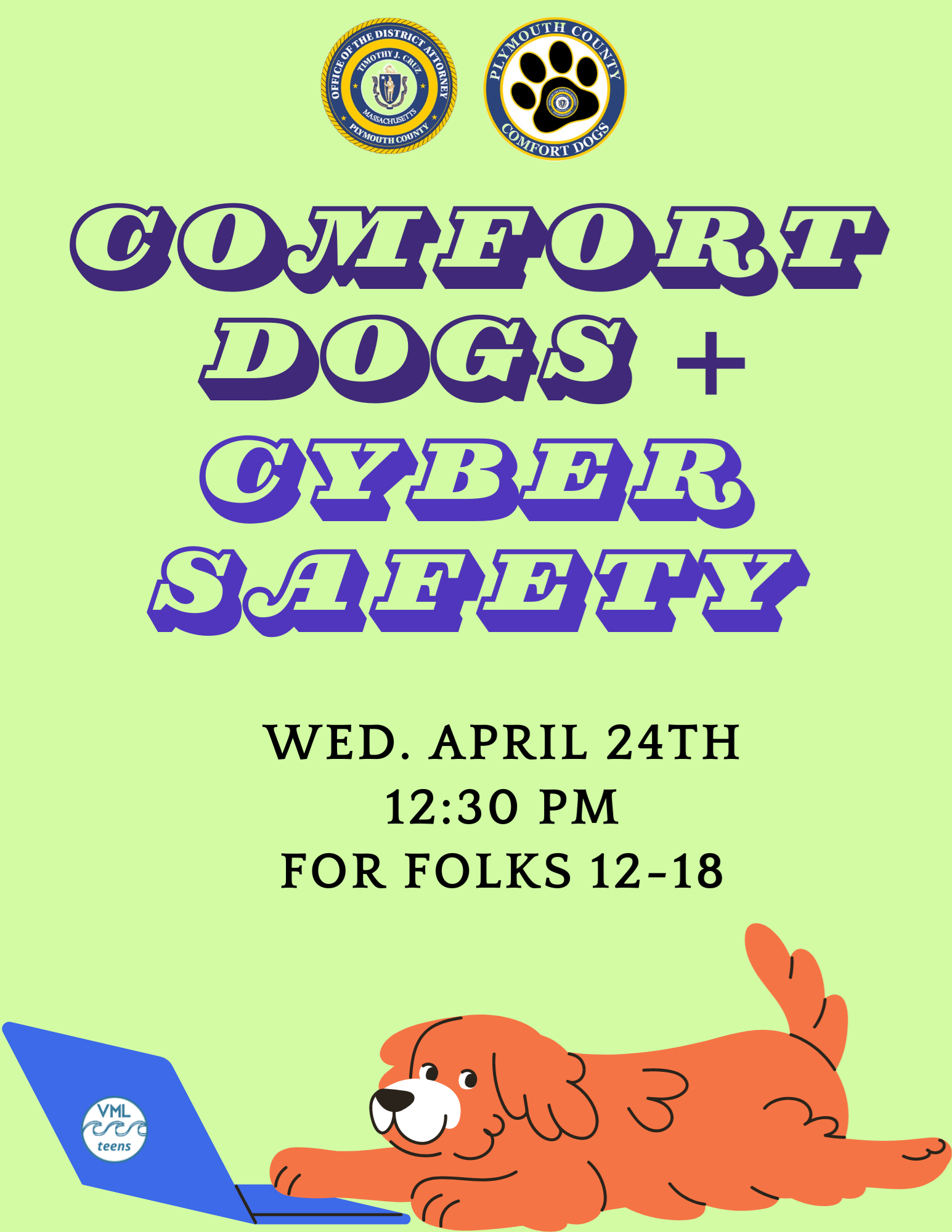 Comfort Dogs + Cyber Safety Wednesday, April 24 from 12:30 - 2:00 p.m. Early release day - head to The Teen Zone after school for a special presentation on Cyber Safety and an appearance by several of the Plymouth County Comfort Dogs!