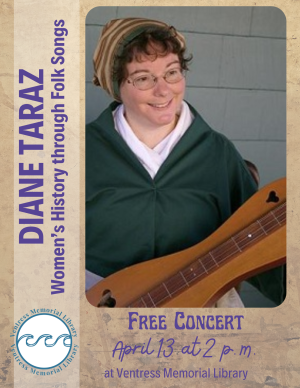 Concert with Diane Taraz Saturday, April 13 from 2:00 - 3:00 p.m. Explore women's history through folk songs. Women in Europe and America from about 1500 to 1850 left few written records, but we can learn much about them through the music that they used to speed their work, lift their spirits, or ease an aching heart.