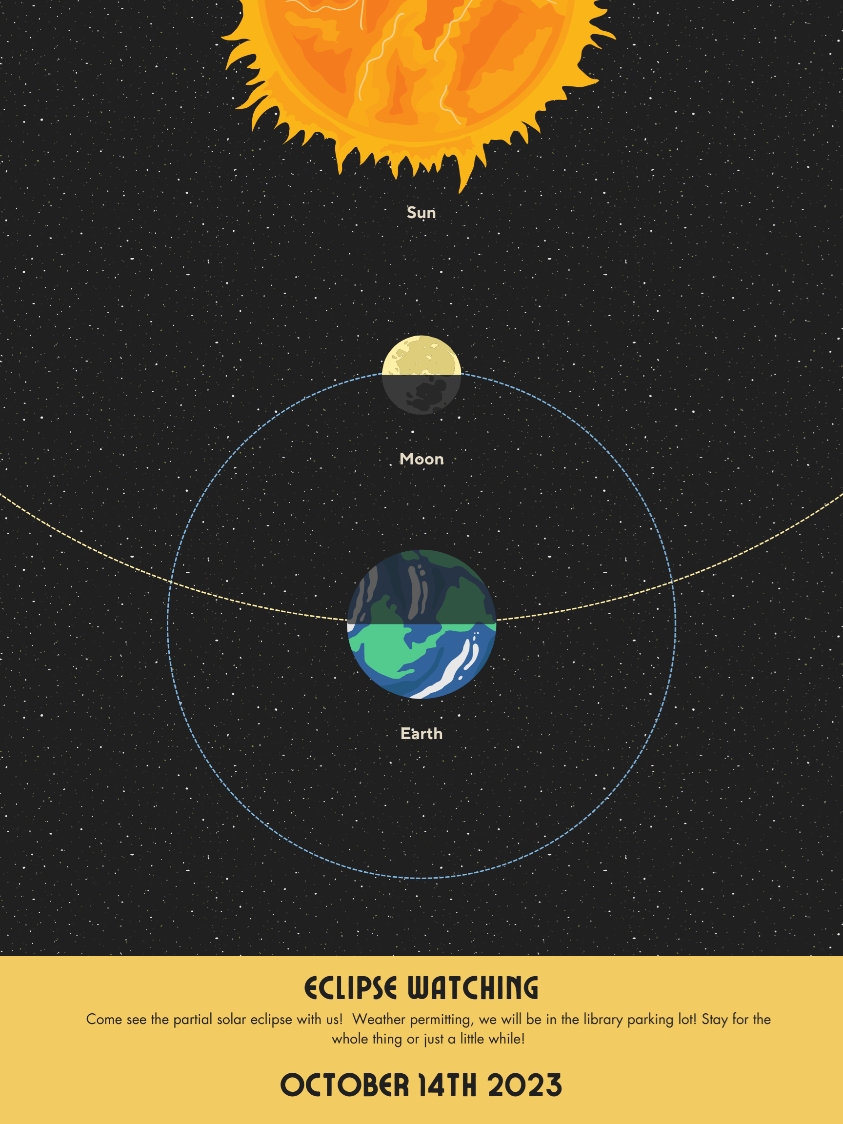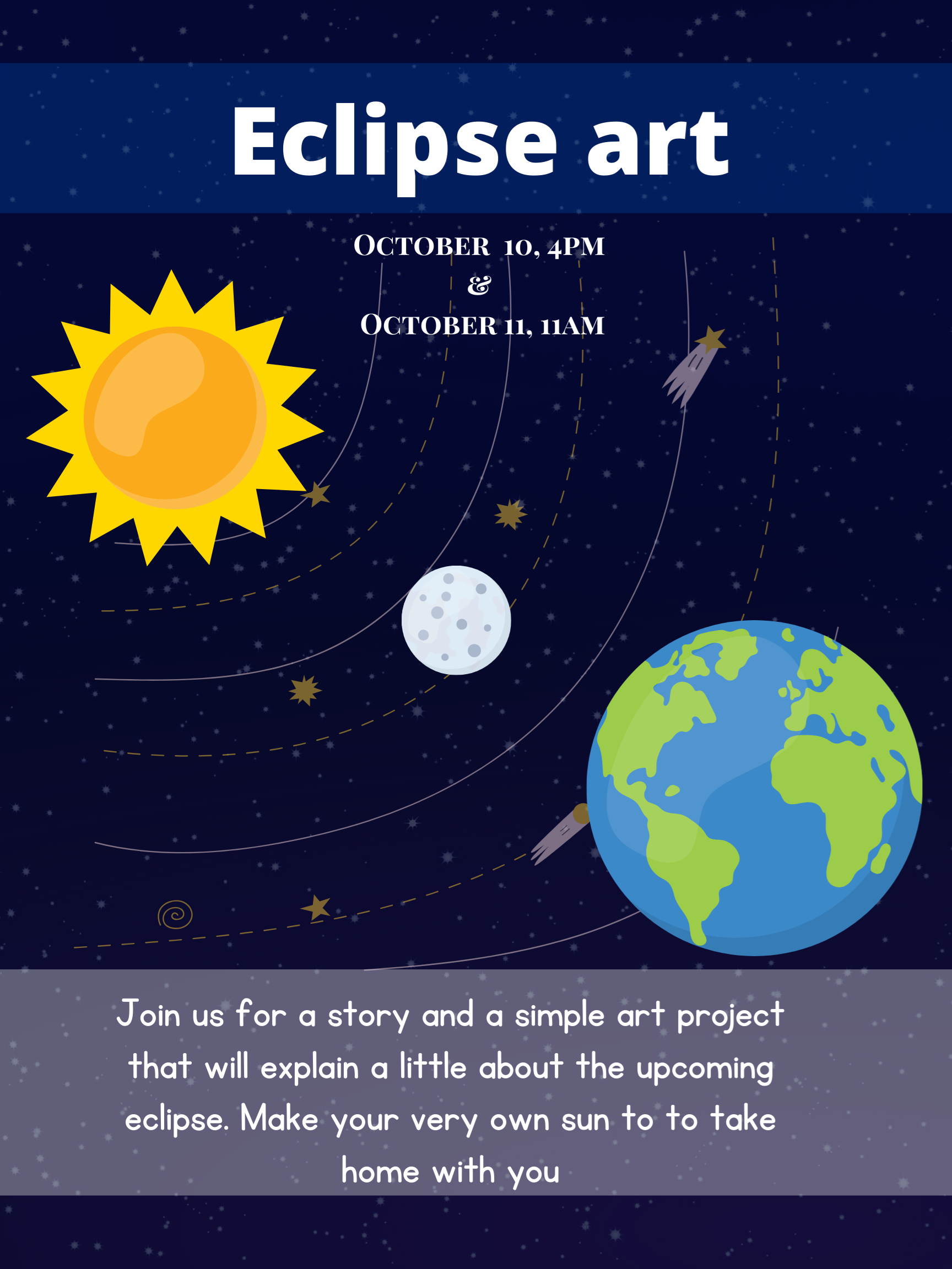 Eclipse Art Tuesday, October 10 at 4:00 p.m. Wednesday, October 11 at 11:00 a.m. We welcome you to join us for a story and a simple art project that will explain a little about the upcoming eclipse. Make your very own sun to take home with you. This program will run twice and will be the same program both days, while supplies last. This program is best for school aged children and their caregivers.