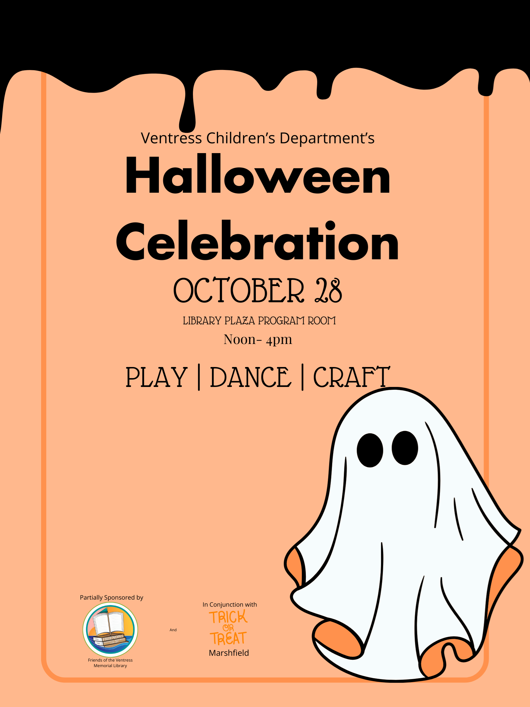 Halloween Celebration Saturday, October 28 from 12:00 - 4:00 p.m. While you're enjoying Trick-or-Treat Marshfield, stop by Library Plaza to have some spooky fun. There will be music and treats. Stay to hang out or just stop by! We can't wait to see everyone's costumes and have a little fun! Treats and other goodies will be first come first served while supplies last.