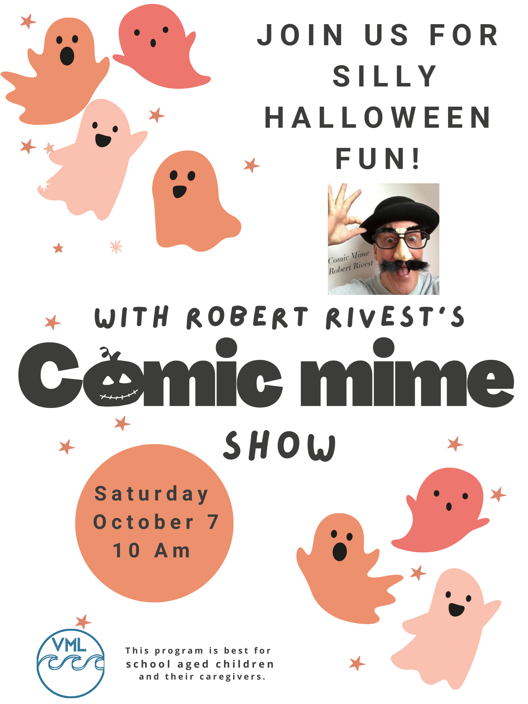 Tricks and Treats with Robert RivestSaturday, October 7 at 10:00 a.m. Join us for this fun, interactive program, Comic Mime Robert Rivest will take us through a series of spooky yet silly Halloween stories. We will also learn how to do some mime tricks and treat our friends to funny mime illusions and hilarious Halloween characters. Come in costume, Robert will use his mastery of mime and movement to help us move and act like our costume characters.