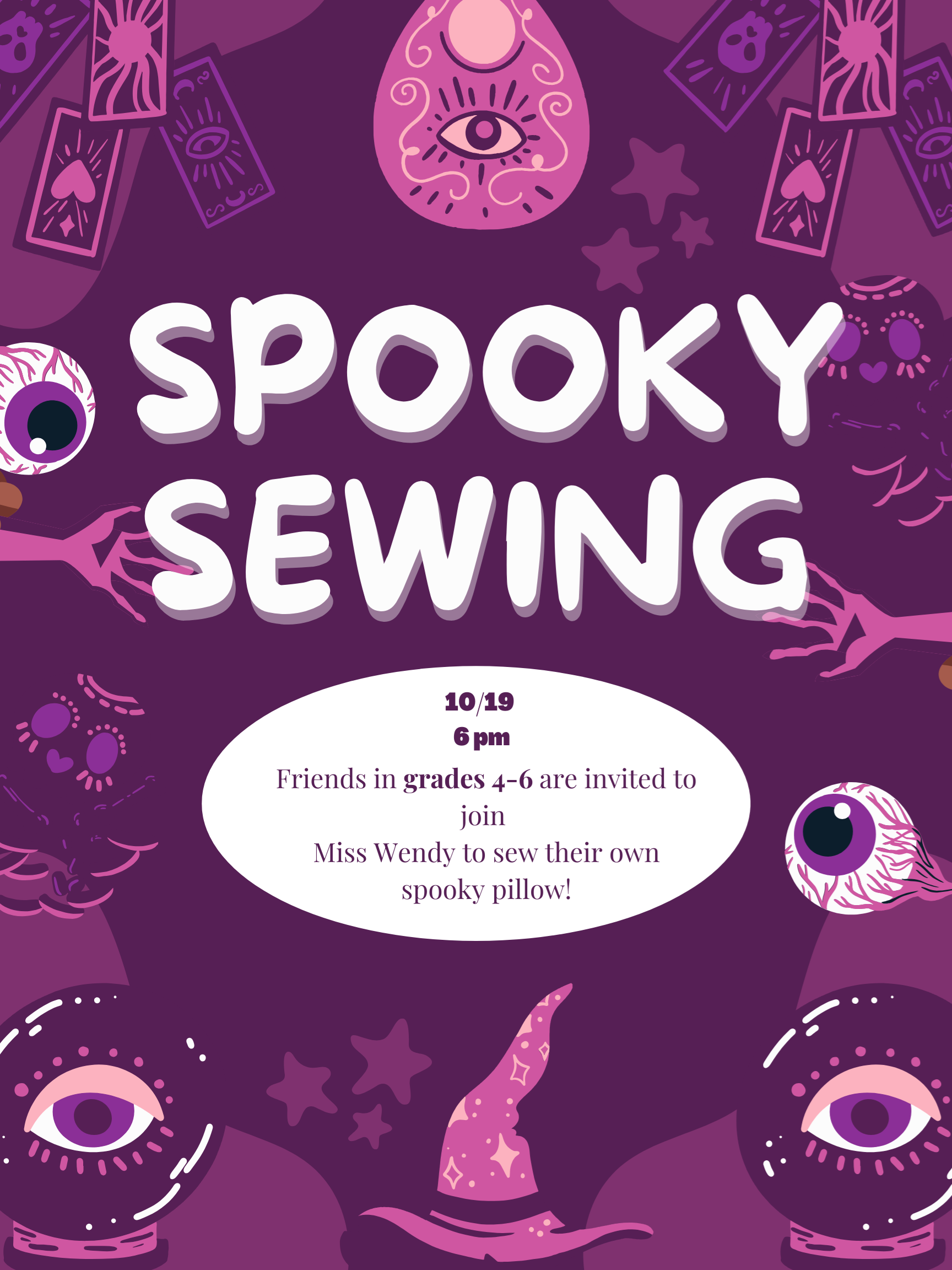 Spooky Sewing Thursday, October 19 at 6:00 p.m. This hour long program will have us sewing pillows in spooky fabrics! Join us for some Halloween fun! This program is for children in grades 4-6 on their own. Children under 9 must have a grown up waiting in the library.