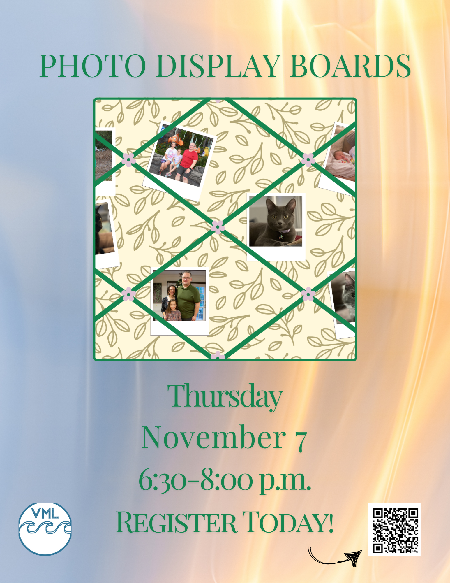 Thursday, November 7th, from 6:30 - 7:30 p.m. Make your very own photo board, just in time for the holiday season. Display all of your treasured moments or give it as a gift! All supplies included. Registration required.