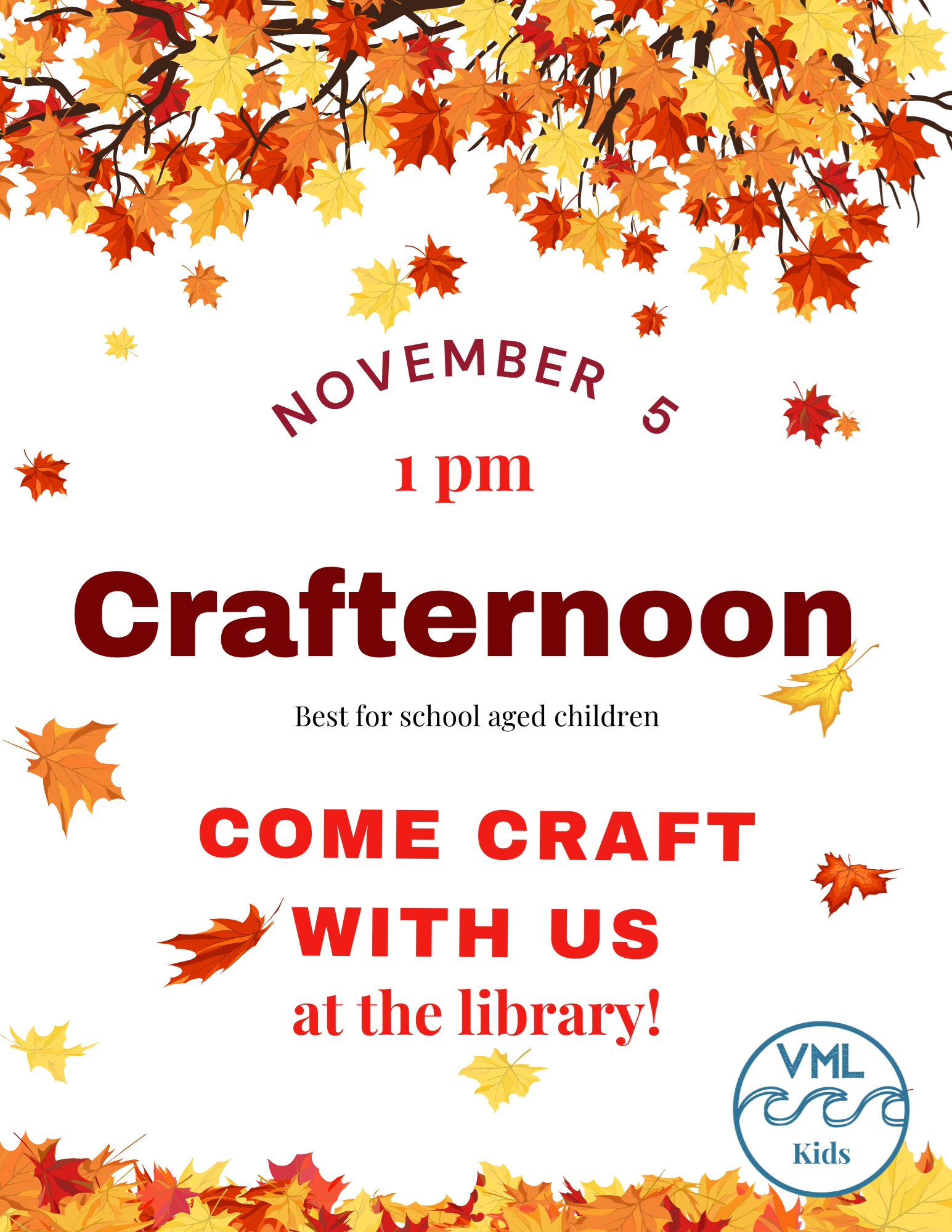 Tuesday, November 5th at 1:00 PM Join us for special school's out Crafternoon! We will be setting up the Children's Program Room with various craft supplies for school aged children. Children under nine must be supervised.