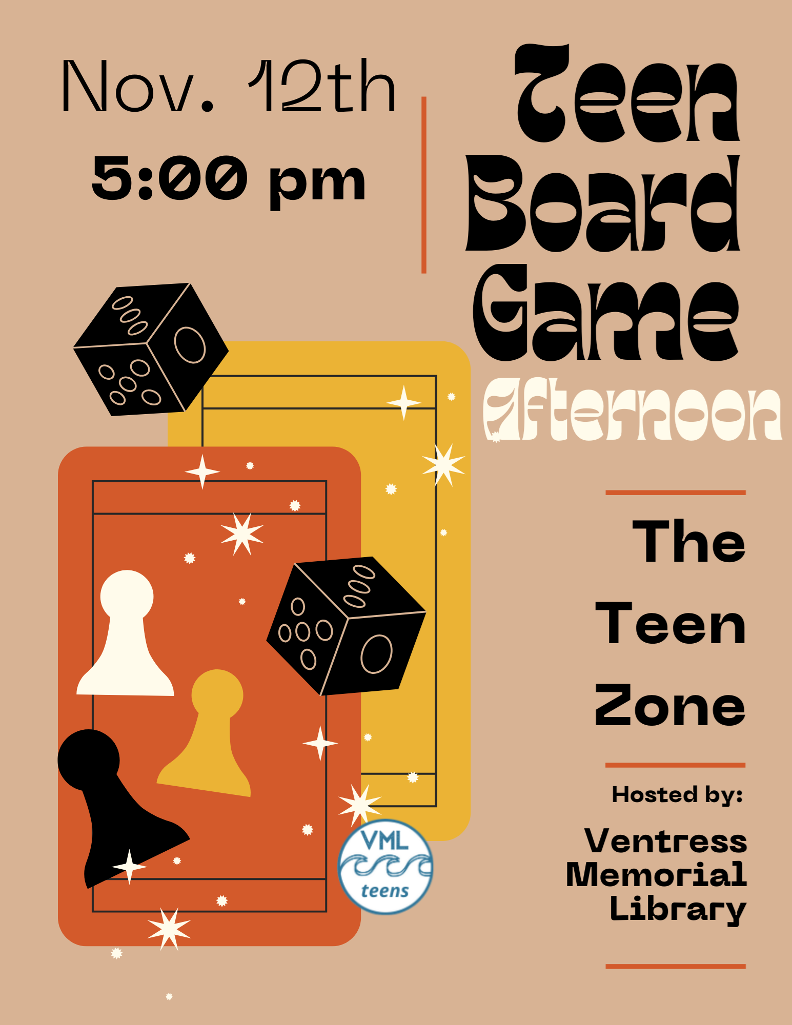 Tuesday, November 12 from 5:00 - 6:30 PM Are you a pro at Settlers of Catan? Does playing Uno for hours with your friends sound like the ideal night out on the town? Come to the Ventress Memorial Library for Teen Board Game Night! Choose a game from our collection and play the night away! If there's a game you want to make sure is available for board game night, email the title of the game to Tori!