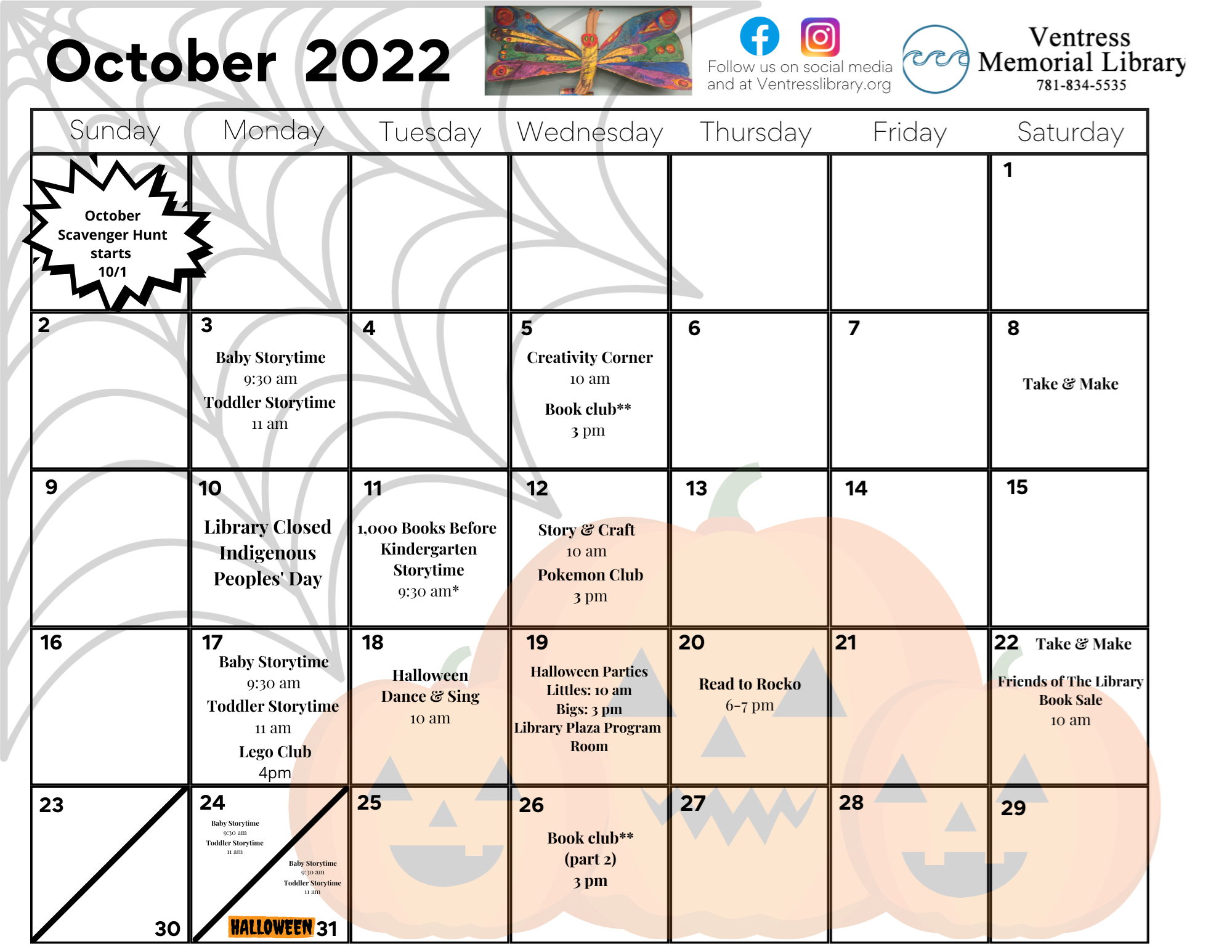 Join Miss Wendy for Halloween themed singing and dancing! This fun program is intended for our Preschool friends, ages 3-5. No registration necessary.