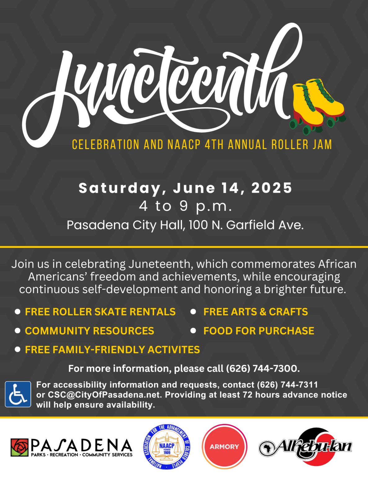 The Juneteenth Celebration and NAACP 4rd Annual Roller Jam will feature FREE family-friendly activities, arts and crafts by Armory Center for the Arts, a live DJ, and community resources for all to enjoy. Roller skates can be loaned out for free, and food will be available for purchase.