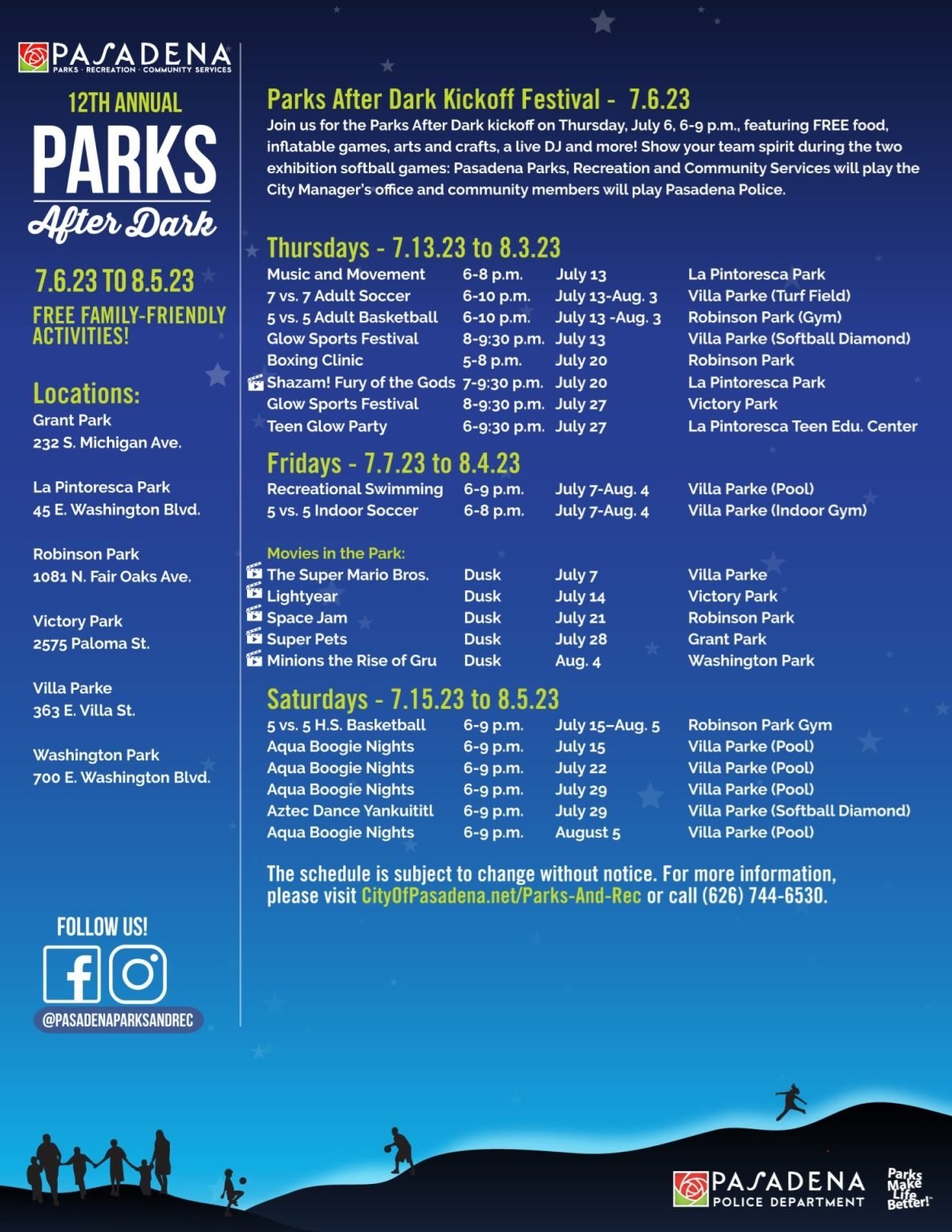 The City of Pasadena’s Parks, Recreation and Community Services Department (PRCS) invites the community to the 12th annual Parks After Dark programs that run Thursday, July 6 – Saturday, Aug. 5, 2023. Parks After Dark takes advantage of Pasadena’s beautiful summer evenings by activating park spaces to provide youth and their families opportunities to experience healthy recreation and active lifestyles.