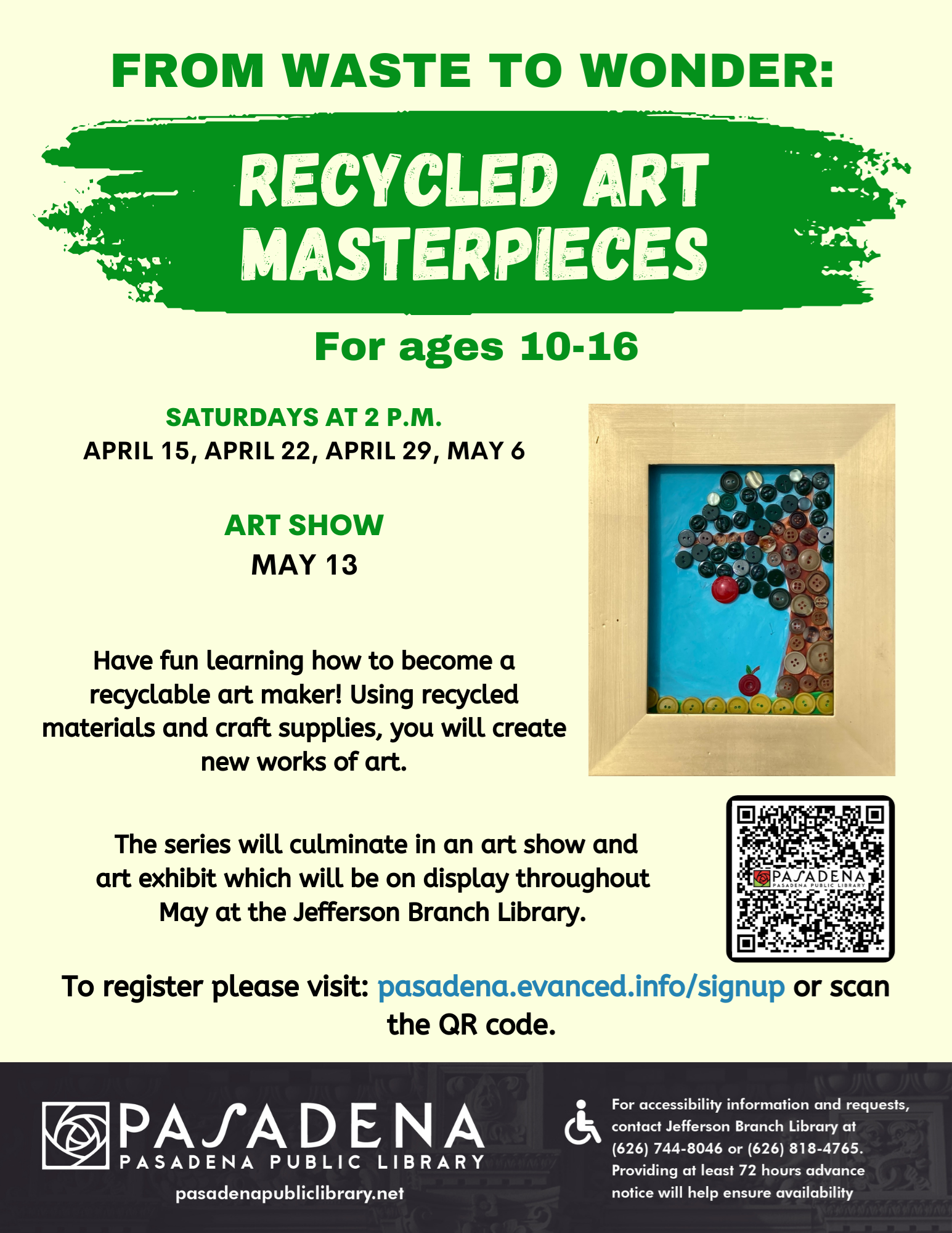 Have fun learning how to become a recyclable art maker! Using recycled materials and craft supplies, create new works of art. The series will culminate in an art show and art exhibit which will be on display throughout May at the Jefferson Branch Library. Register for the series here! For ages 10-16.