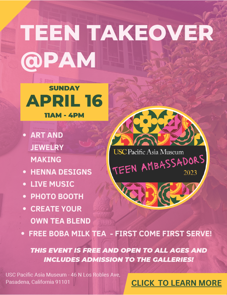 Join USC PAM for a fun afternoon of activities designed by the USC PAM Teen Ambassadors! Enjoy making art and jewelry, get a henna tattoo, create your own tea blend, hear live music, and more. Snap a photo at our custom photo booth and get a unique souvenir for completing all activities. FREE boba milk tea for the first 100 teen visitors! This event is FREE and open to all ages and includes admission to the galleries!