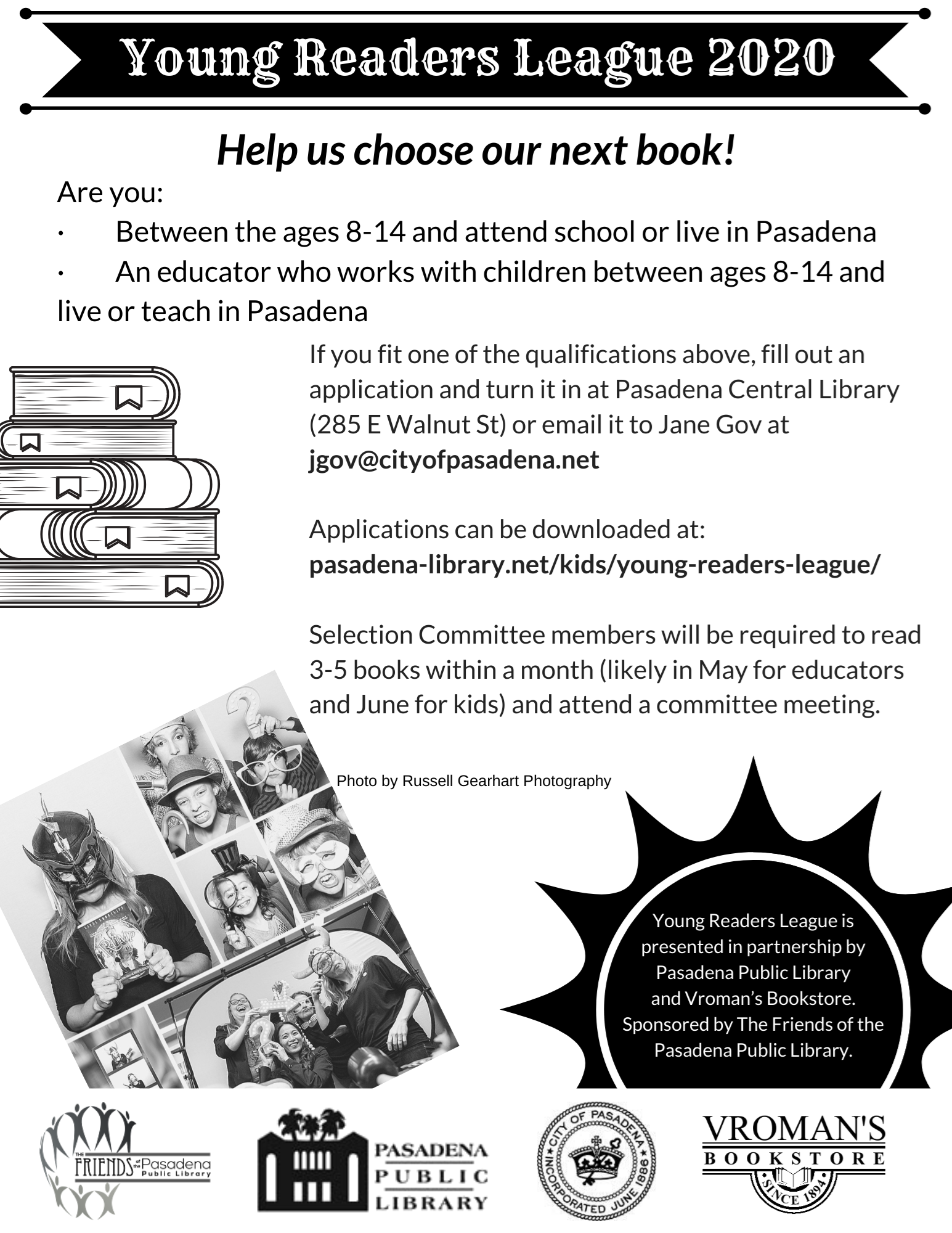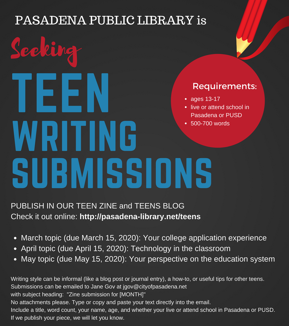 We'll be having a workshop about filling out job applications during our April meeting and will be exploring other Youth Master Plan topics during our May meeting. For teens only. To sign up, email Jane Gov at jgov@cityofpasadena.net