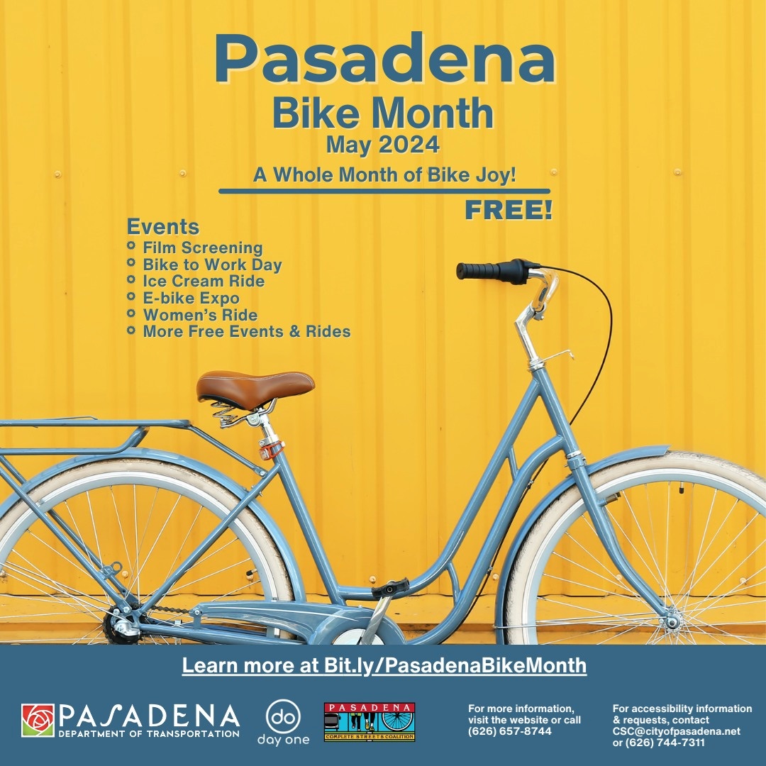 Pasadena Bike Month is a month-long campaign of fun and healthy bicycle activities that Pasadena residents and visitors can experience in the month of May. Activities will include group rides, social gatherings, a film screening, and guided tours. Pasadena Bike Month is made possible by the City of Pasadena, Day One, and Pasadena Complete Streets Coalition. To see the the full calendar, click here: https://www.godayone.org/bikemonthpasadena