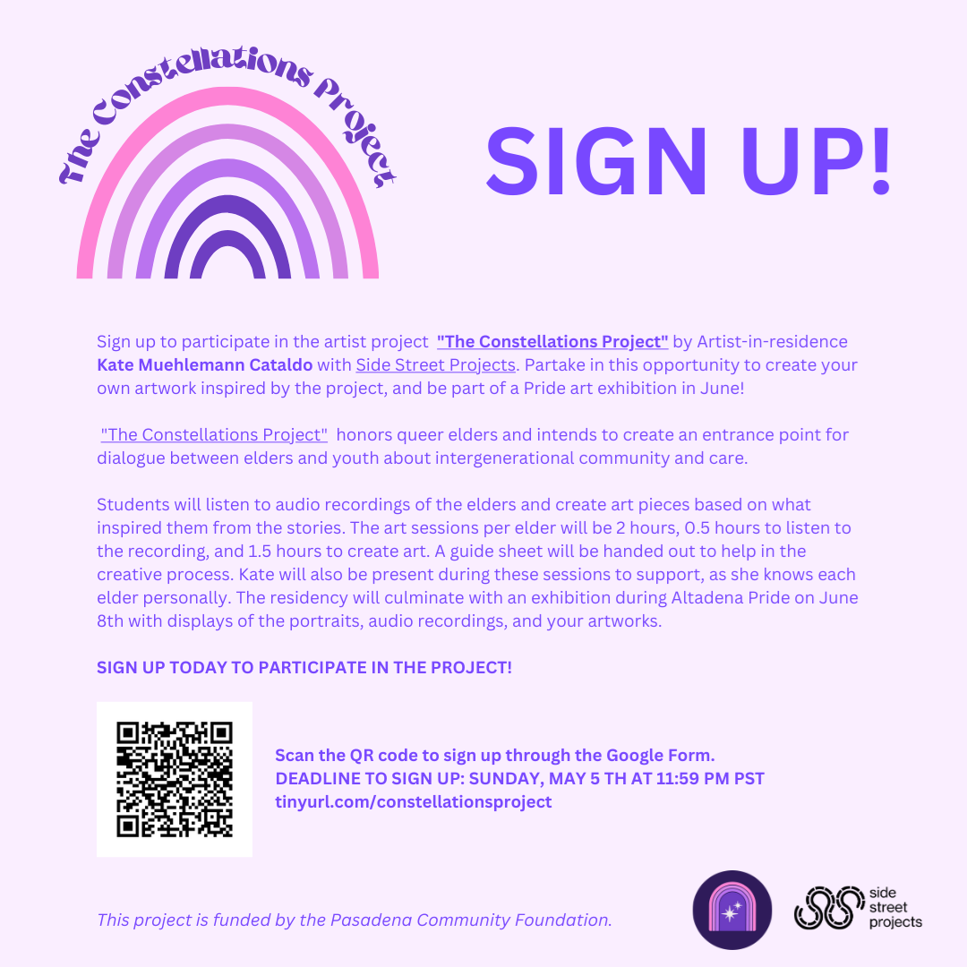 Calling all queer youth! Sign up to participate in the artist project "The Constellation Project" by Artist-in-residence Kate Muehlemann Cataldo with Side Street Projects. Partake in this opportunity to create your own artwork inspired by the project, and be part of a Pride art exhibition in June! Read more about it up above. If you're interested in participating in this project, scan the QR code or click on the link here!