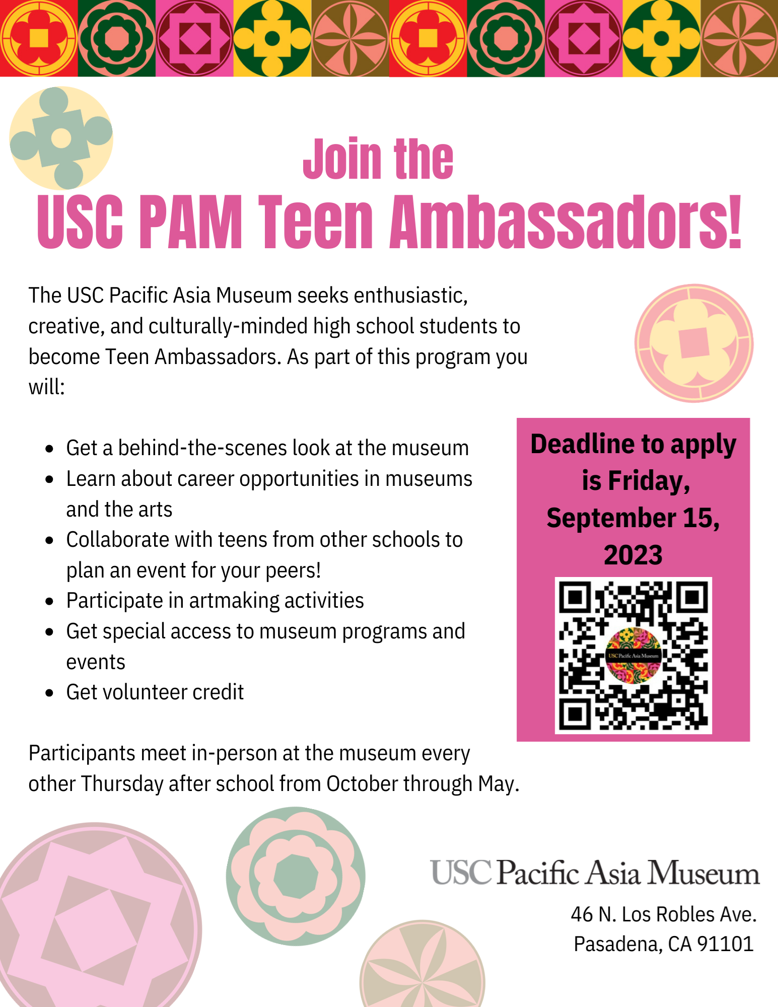 Applications are now open for the USC PAM Teen Ambassador Program for high school students! As Teen Ambassadors to the museum, students will get to plan teen-focused events and develop teen-centered content, learn about careers in museums, engage in critical discussions and creative activities, and receive volunteer credit. This is a great way for students to learn more about the USC community and engage with students working with other local institutions.