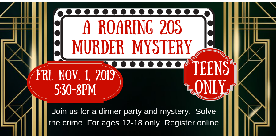 Join us for a dinner party and mystery. It’ll be up to you to solve the crime. Prowl the stacks, hunt for clues, unveil the truth… and you just might apprehend the culprit before he or she strikes again. Costumes welcome, but not required. This year’s theme is the Roaring 20s. This program is for ages 12-18 only.