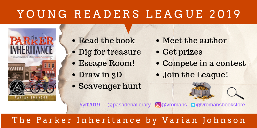 An Afternoon with Author Varian Johnson Saturday, November 23, 3pm Pasadena Central Library, Auditorium Meet Varian Johnson, author of The Parker Inheritance, this year's Young Readers League selection. Have your book signed. Join in activities and games. Enjoy photo opportunities and win prizes. The winners of the art and writing contests will also be announced. For all ages. No registration required.
