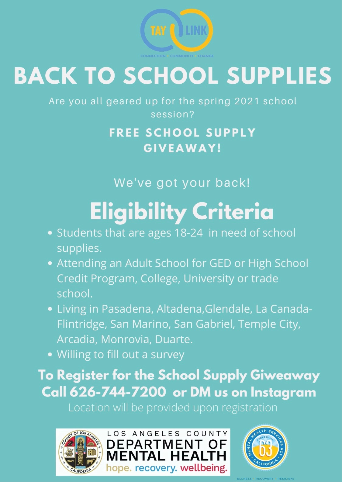 School supplies for ages 18-24 contact Te McGrath at tmcgrath@cityofpasadena.net