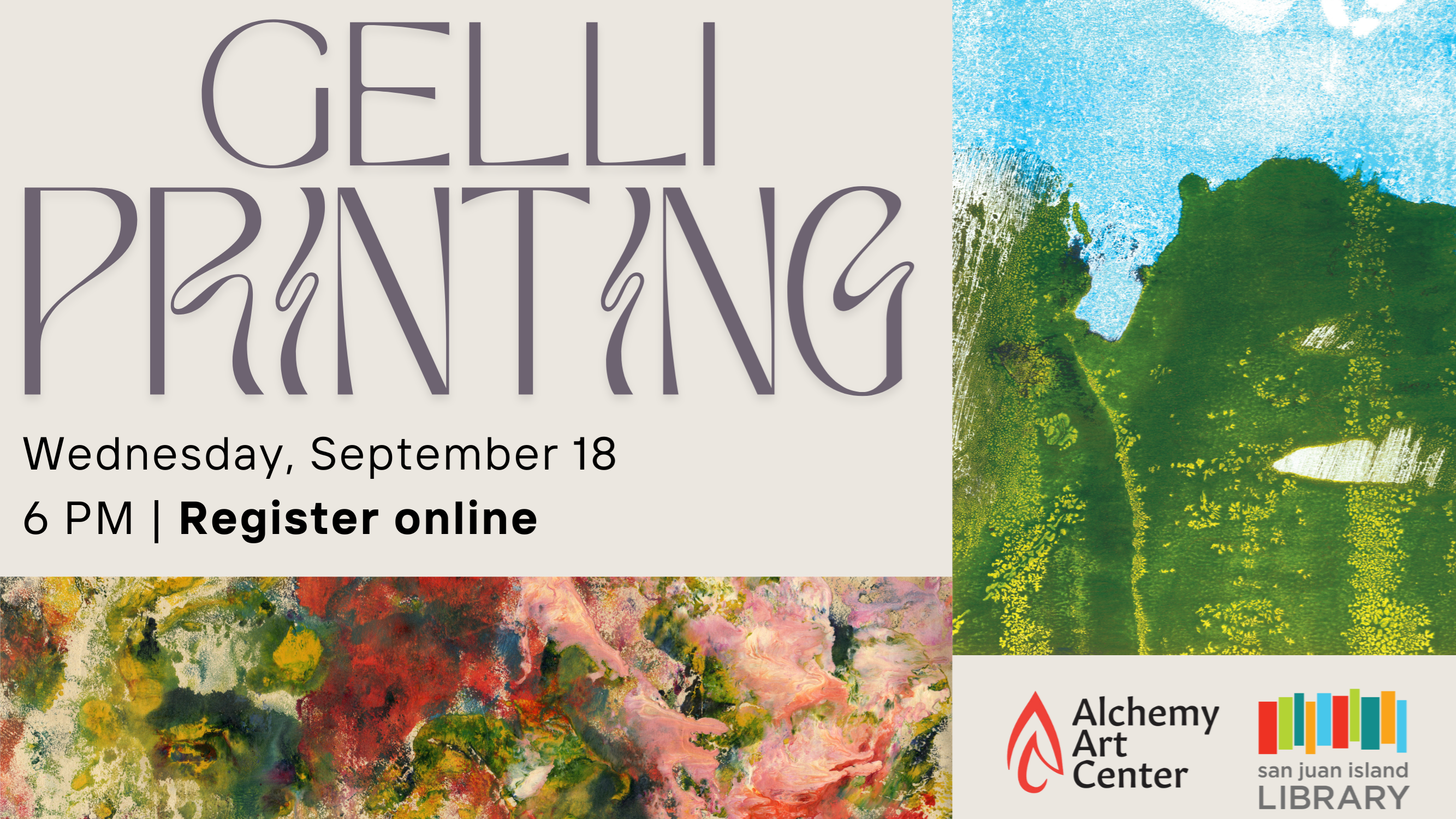 ADULT Gelli Printing Sept. 18th, 6pm Learn Gelli printing techniques to create your very own unique postcards to send to your friends. Reserve your spot now!