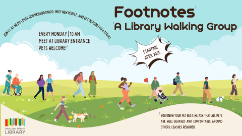 Footnotes: A Library Walking Group Mondays at 10:00am Join us every Monday at 10 am as we discover our neighborhood, meet new people, and get outside for a stroll. Pets are welcome, but you know your pet best. We ask that all pets are well-behaved and comfortable around others. Leashes required. We will meet outside the library entrance.