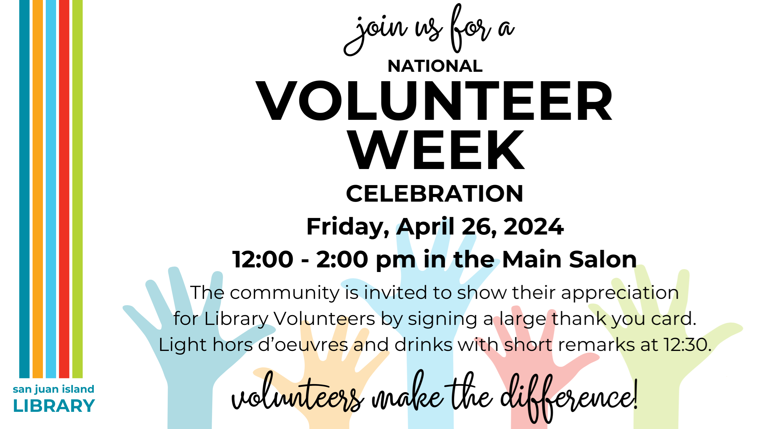 Library Volunteers Celebration Join us for a volunteer appreciation celebration in observance of National Volunteer Week 2024! The community is invited to join us in the Library's Main Salon beginning at 12:00pm on Friday, April 26th for light lunch hors d'oeuvres and drinks and to sign a large card recognizing the contributions of library volunteers.